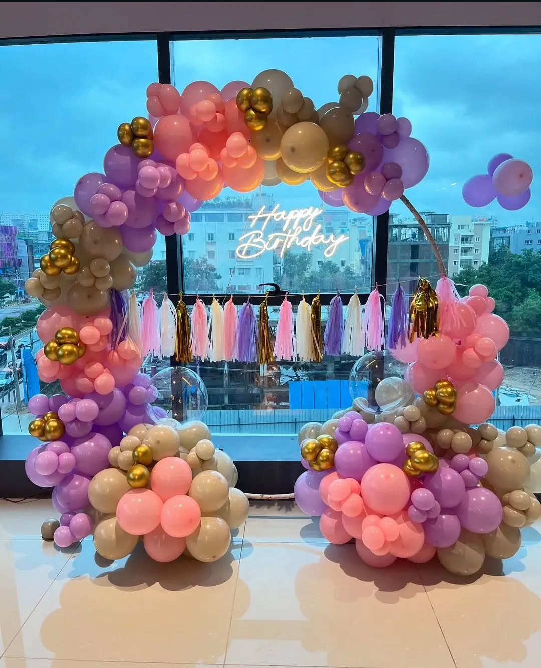 This Pastel Balloon Arch with Gold Accents is a sophisticated and whimsical decoration setup, ideal for a birthday celebration. The pastel tones of pink, lavender, and beige are highlighted with metallic gold balloons, adding a luxurious touch. The neon "Happy Birthday" sign enhances the elegance...