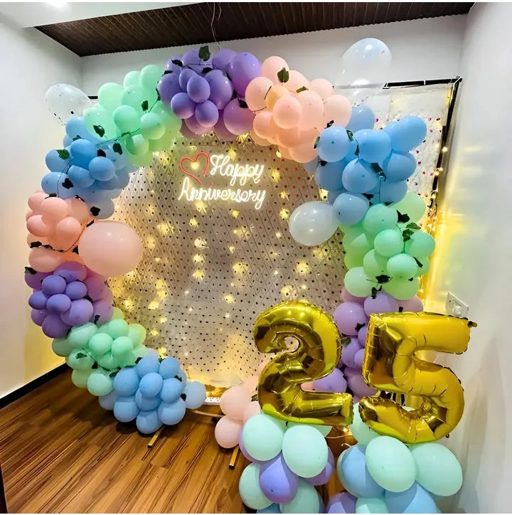 This beautiful pastel balloon arch setup is perfect for celebrating 25 years of love and togetherness. Featuring soft pastel shades of blue, pink, green, and purple, the decor gives a dreamy and elegant touch. The neon "Happy Anniversary" sign, combined with a sparkling golden mesh backdrop and f...