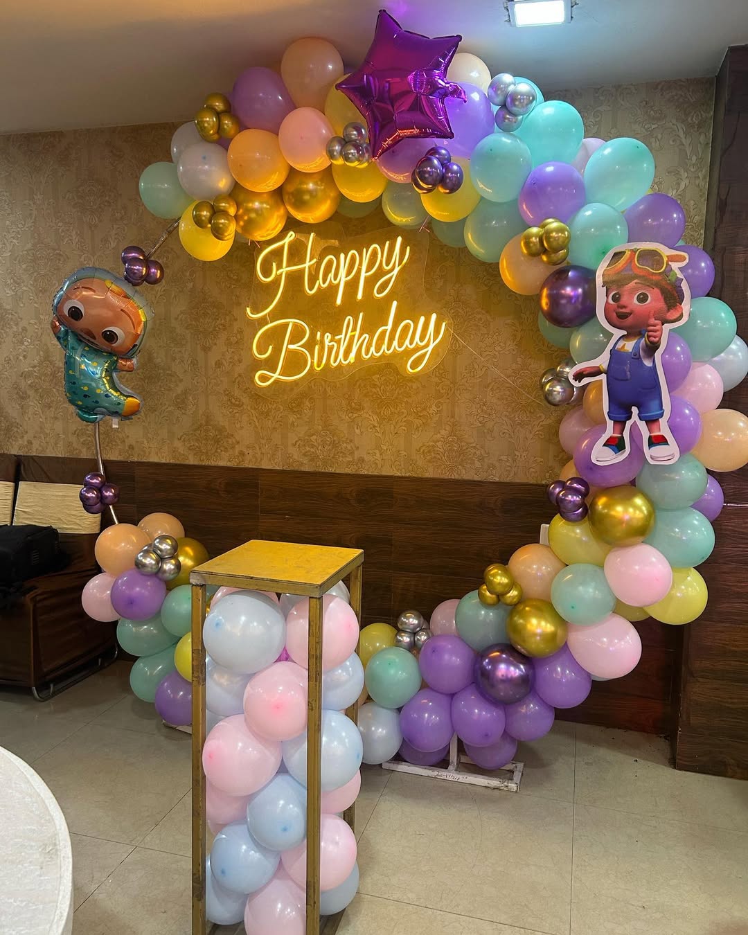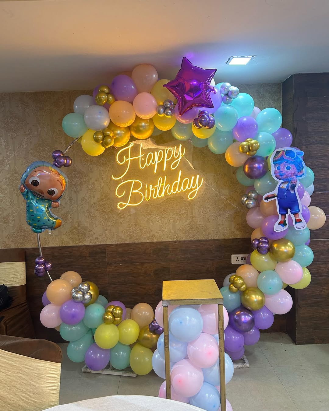 *️⃣This circular pastel balloon arch setup is perfect for a soft, dreamy birthday celebration. Featuring a neon "Happy Birthday" sign, pastel balloons in soft tones of pink, yellow, purple, blue, *️⃣and *️⃣gold, and cute themed character foil balloons, this design offers a fun yet elegant birthda...