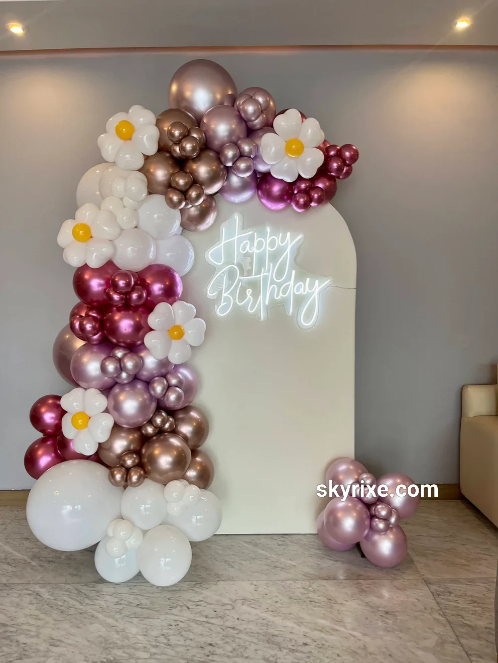 This decoration creates a soft, joyful birthday atmosphere defined by pastel metallic colors and floral balloon artistry. The arched panel provides a clean focal structure, while the organic balloon cascade adds movement and sculptural elegance. Metallic mauve and rose-gold tones introduce subtle...