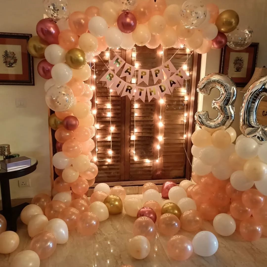 *️⃣This luxurious peach, gold, and white birthday decoration creates a classy and sophisticated ambiance for milestone birthdays. Featuring a beautiful balloon arch, number foil balloons, a ‘Happy *️⃣Birthday’ banner, and warm LED fairy lights, this setup is perfect for home, event halls, or hote...