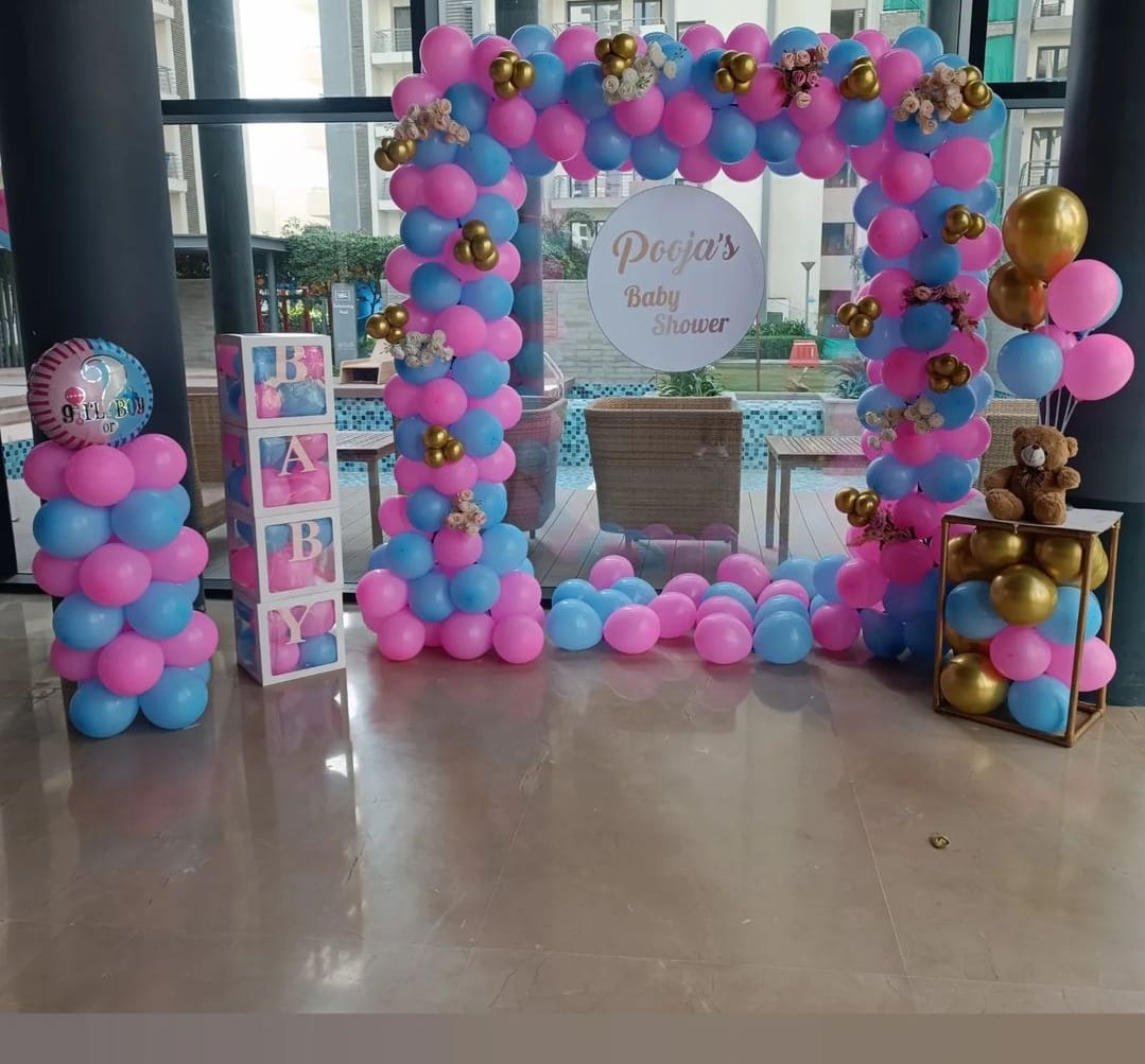 ✯ This adorable baby shower balloon setup is designed in a traditional pink and blue color scheme, symbolizing the excitement of welcoming a baby. The design features a square balloon arch with alternating blue and pink balloons, decorated with gold accents and small floral arrangements for an el...