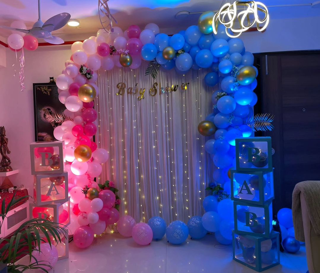 ✯✯This enchanting baby shower decoration features a beautiful half-arch balloon arrangement in classic pink and blue, symbolizing a gender-neutral or gender-reveal celebration. The soft white curtain backdrop with delicate
