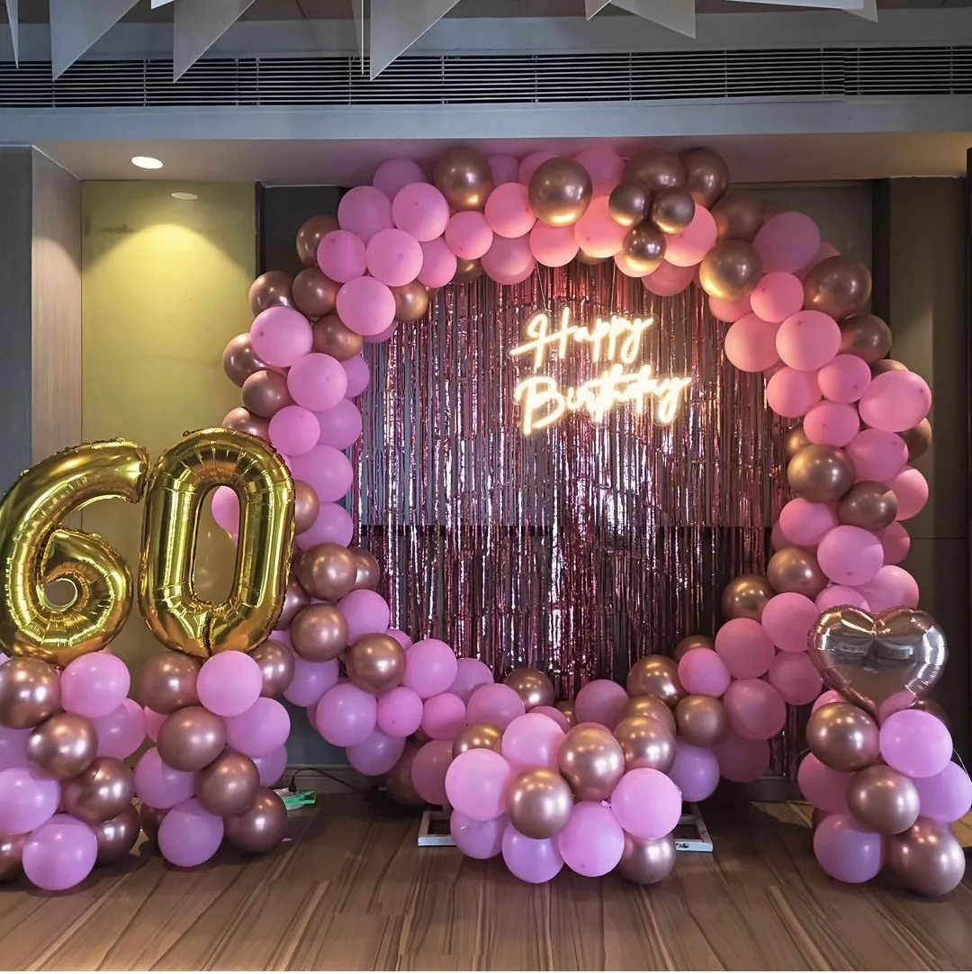 This luxurious pink and gold themed birthday backdrop is designed for milestone celebrations, perfect for a 60th birthday or any grand event. The setup features a large circular balloon arch blending pastel pink and metallic gold balloons...