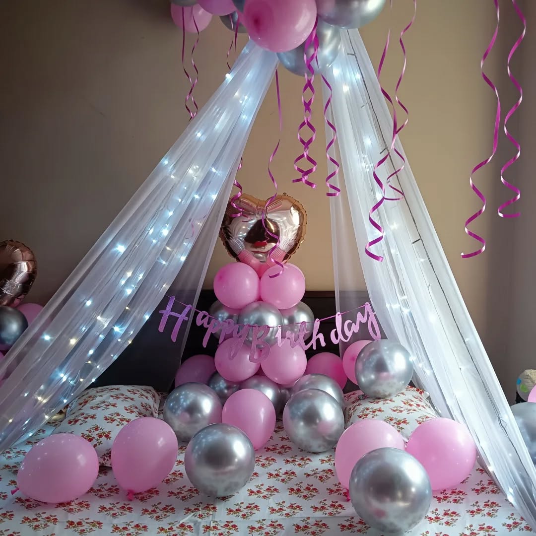 This elegant birthday room decoration features a pink and silver color scheme. The setup includes a white sheer canopy cascading from the ceiling with glowing fairy lights, creating a soft and luxurious ambiance. A prominent heart-shaped foil balloon sits as the centerpiece, surrounded by cluster...