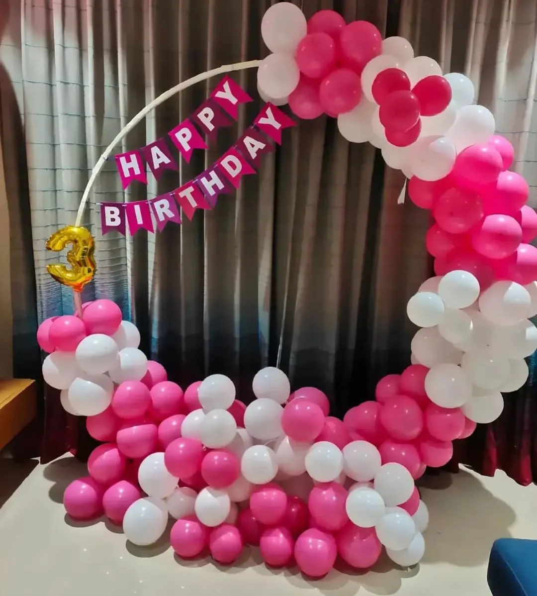 This charming pink and white balloon arch is perfect for a 3rd birthday celebration. The soft and bright colors create a fun and festive atmosphere, making it ideal for kids' birthday parties, baby showers, and themed celebrations. The arch features a "Happy Birthday" banner with a golden...