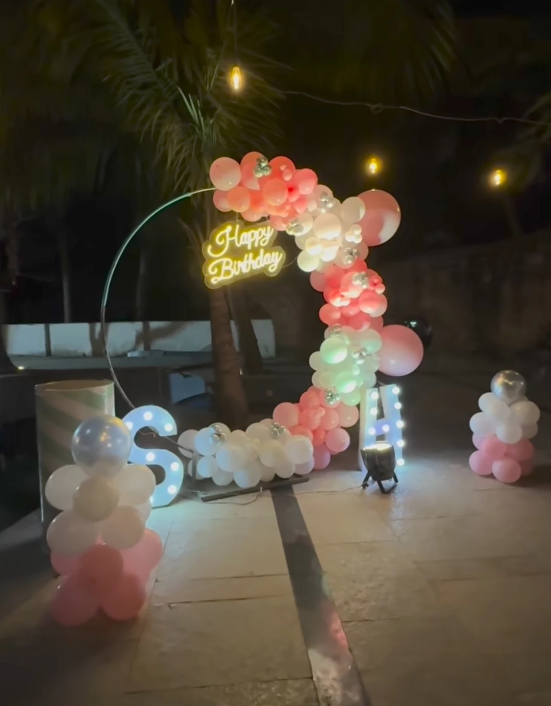 Celebrate your special day in style with this elegant pink and white birthday ring décor. Featuring a premium circular backdrop, glowing neon signage, LED marquee letters, and soft pastel balloon styling, this setup is perfect for creating a magical night celebration.