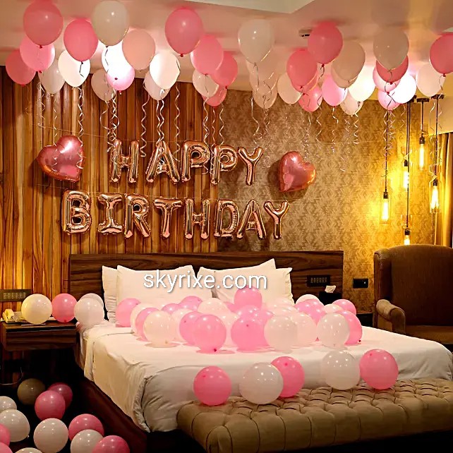A dreamy pink-and-white birthday room décor featuring ceiling balloons, bed styling, and rose-gold “Happy Birthday” foil balloons with heart accents. This elegant setup transforms any bedroom into a soft, romantic birthday celebration space—perfect for partner surprises, midnight celebrations, or...