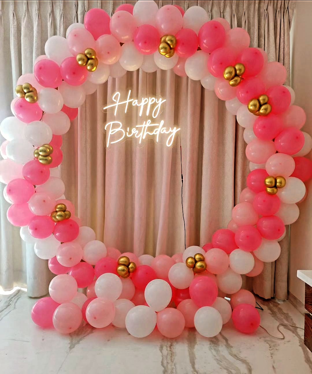 *️⃣This delicate and elegant birthday balloon setup features a soft pink, white, and gold balloon arch arranged in a circular frame. Small gold balloon clusters add a luxurious touch, while the neon *️⃣"Happy Birthday" sign enhances the celebration mood. The feminine and classy aesthetic makes it...