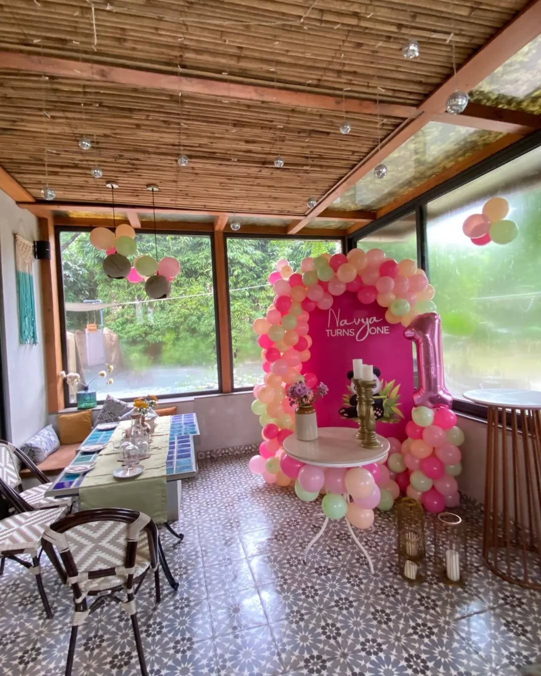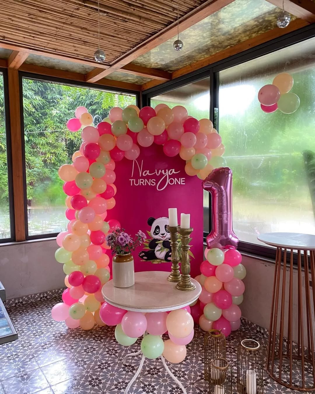 This adorable pink-themed first birthday setup is designed with a soft and charming aesthetic. The decor features a customized pink backdrop with the birthday child's name and a cute panda illustration, surrounded by a pastel balloon arch in shades of pink, peach, and light green. A pink foil num...