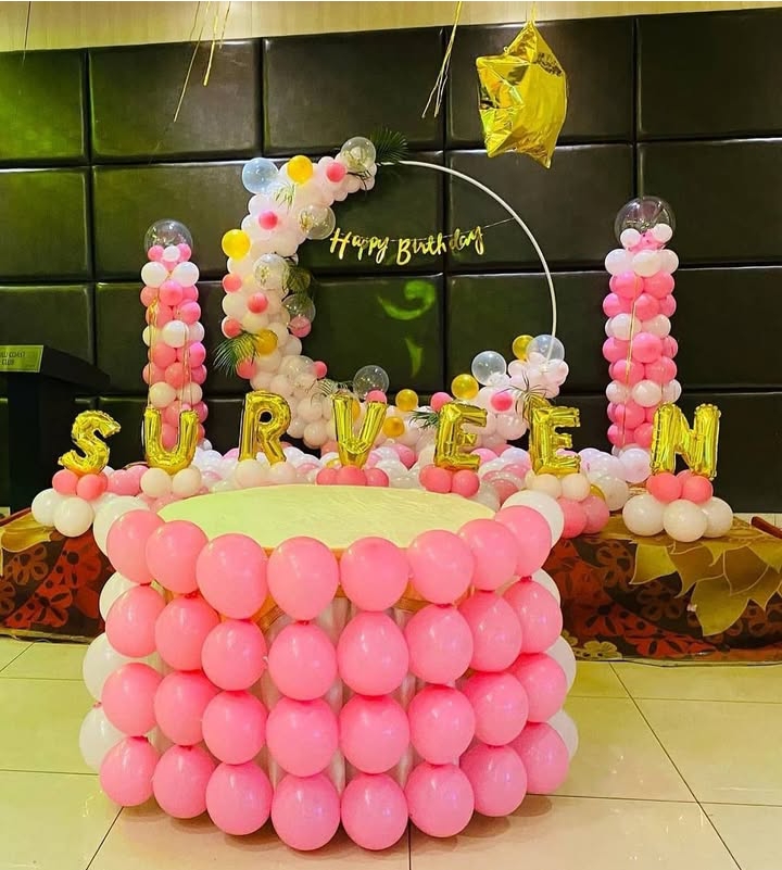 A glamorous, pastel-themed balloon setup centered around a large circular frame, personalized with the celebrant's name “SURVEEN” in gold foil letters. The decor showcases blush pink, white, yellow, and transparent balloons for a soft, elegant, and fun birthday atmosphere. The balloon-wrapped cak...