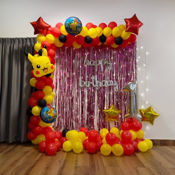 Make your child’s first birthday extra special with this fun and colorful Pikachu Theme 1st Birthday Decoration Setup. Inspired by the popular Pokémon character, this décor features bright red, yellow, and black balloons combined with a sparkling pink shimmer curtain backdrop, creating a vibrant ...