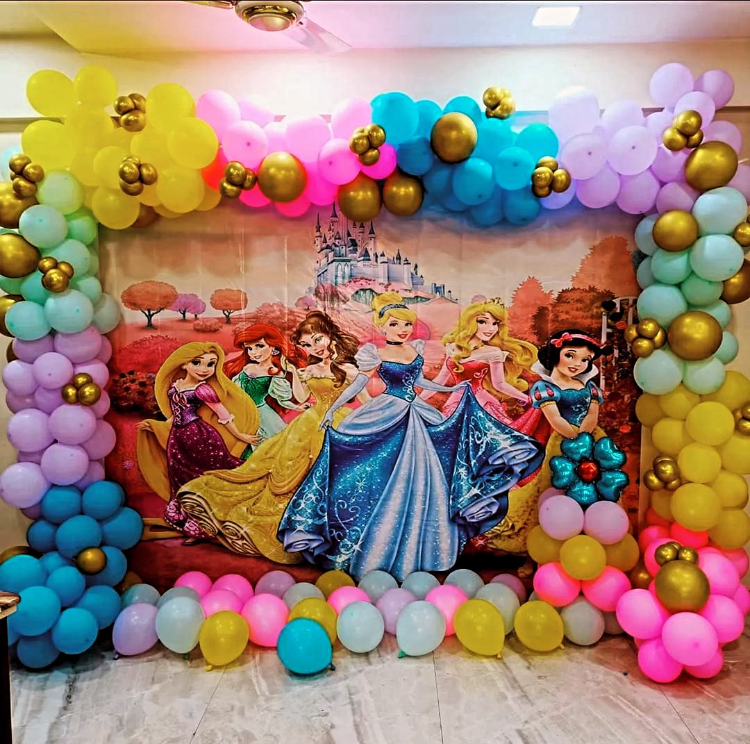 This magical princess-themed balloon decoration is perfect for birthday parties for little girls who love fairytales and Disney princesses. The vibrant pastel balloons in pink, blue, yellow, and purple, along with gold accents, create a dreamy look that complements the princess backdrop featuring...