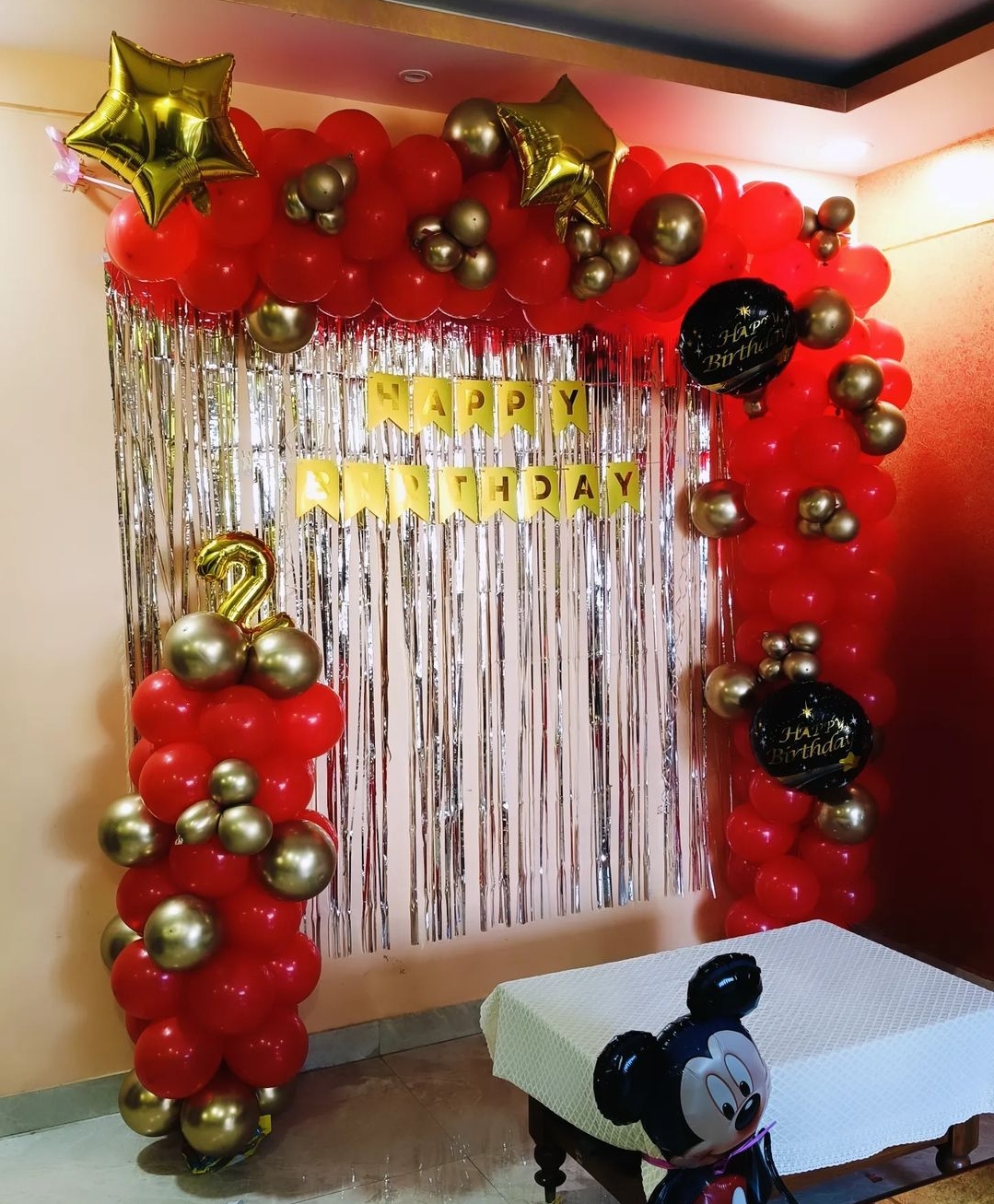 *️⃣This red and gold birthday decoration features a classic, vibrant backdrop with a metallic fringe curtain, balloon garlands, and a Mickey Mouse-themed touch. The color scheme adds a bold and lively feel, perfect for kids' birthdays, especially for a 2nd birthday celebration as shown in the set...