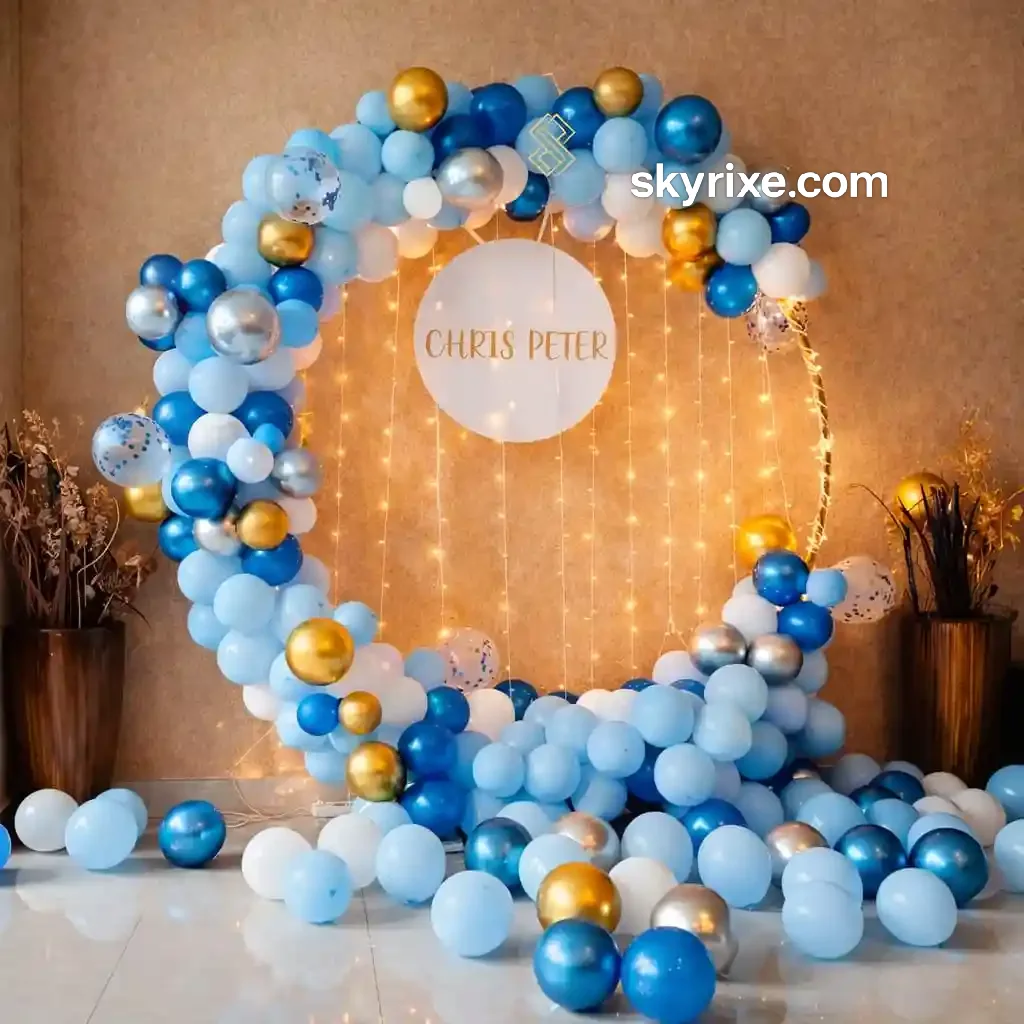 Make your celebration stand out with this elegant Royal Blue & Gold Ring Backdrop Balloon Decoration, designed to deliver a premium and visually stunning setup. The circular ring backdrop forms a perfect frame, decorated with a rich balloon garland in blue, white, and gold chrome tones.