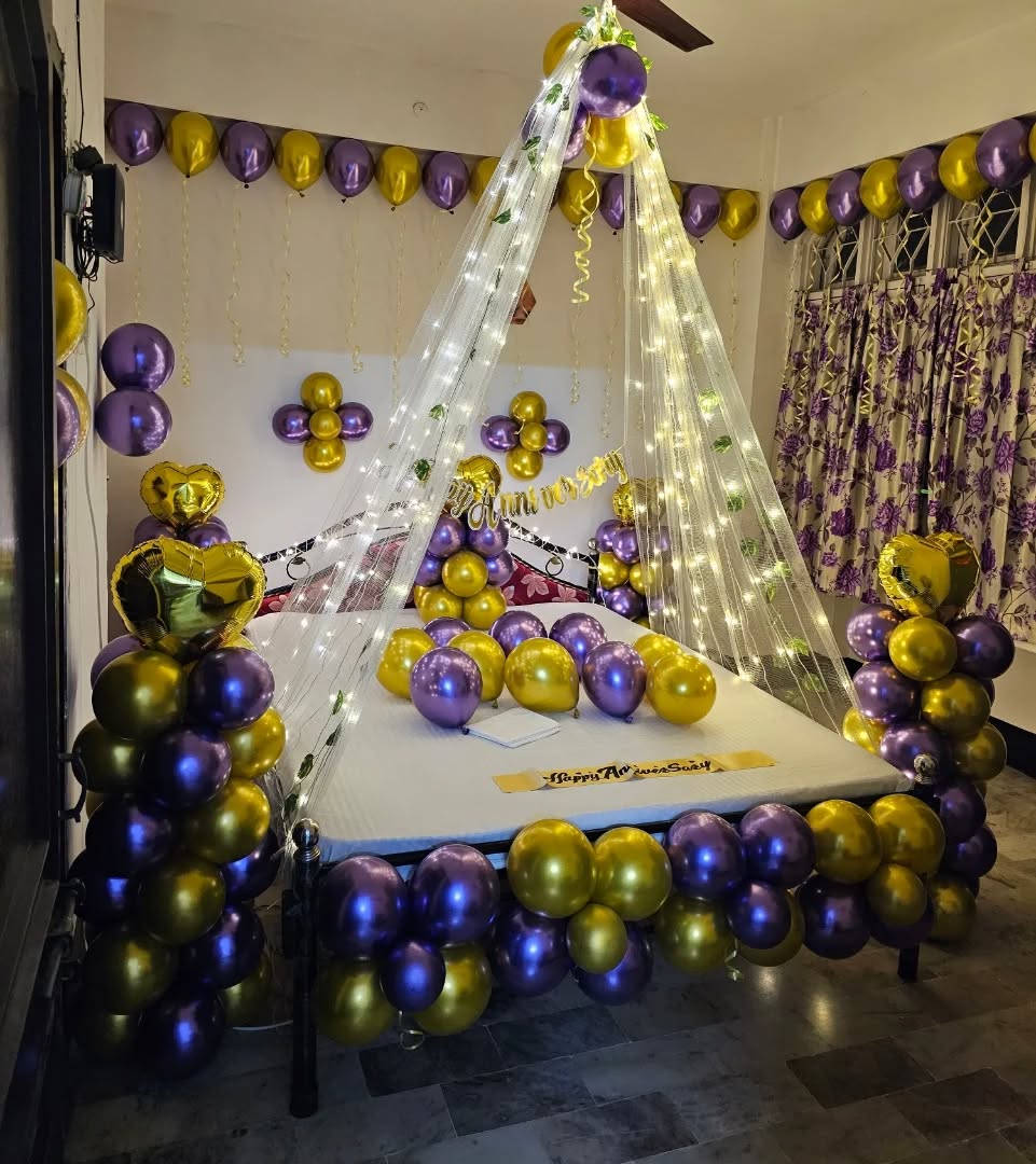 This is a beautifully designed romantic anniversary room decoration setup. It uses a combination of gold and purple balloons, symbolizing luxury and elegance. A canopy made from white sheer fabric adorned with fairy lights cascades from the ceiling, creating a dreamy and intimate atmosphere. The ...