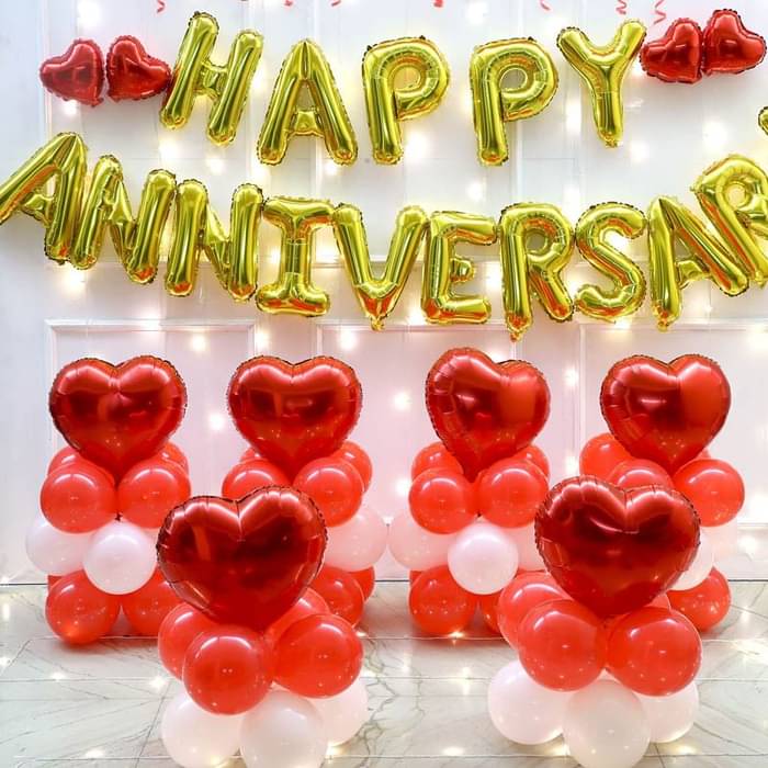 This luxurious and romantic anniversary decoration features a stunning combination of gold, red, and white balloons, fairy lights, and a rose petal "I ❤️ U" message on the floor. The elegant gold letter balloons spell out "HAPPY ANNIVERSARY", making it a perfect setup for a surprise romantic even...