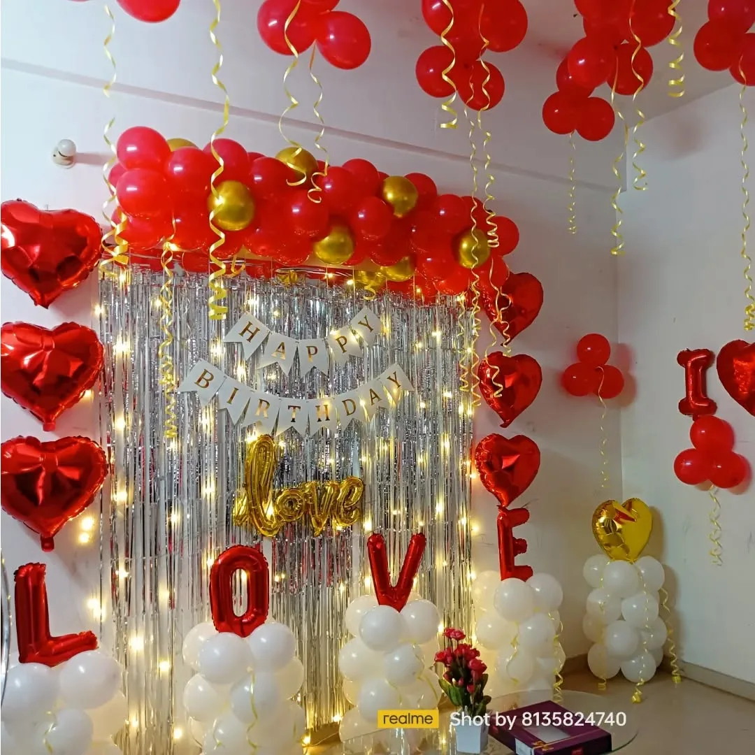 This romantic and glamorous birthday setup features a stunning red and gold balloon arrangement combined with silver tinsel curtains, warm fairy lights, and heart-shaped foil balloons. The "LOVE" balloon letters and "Happy Birthday" banner add an extra touch of elegance and romance, making it per...
