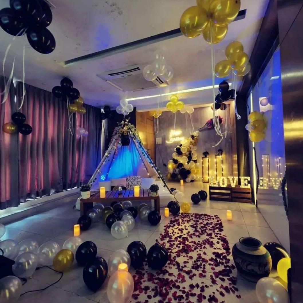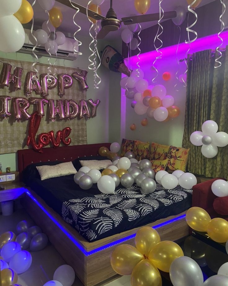 ✯✯This room decoration is designed for a romantic and stylish birthday celebration. It features a combination of metallic, white, and gold balloons, warm LED lighting, and a cozy setup on the bed and surrounding areas. The "Happy Birthday" and "Love" balloon letters add a personalized touch, maki...