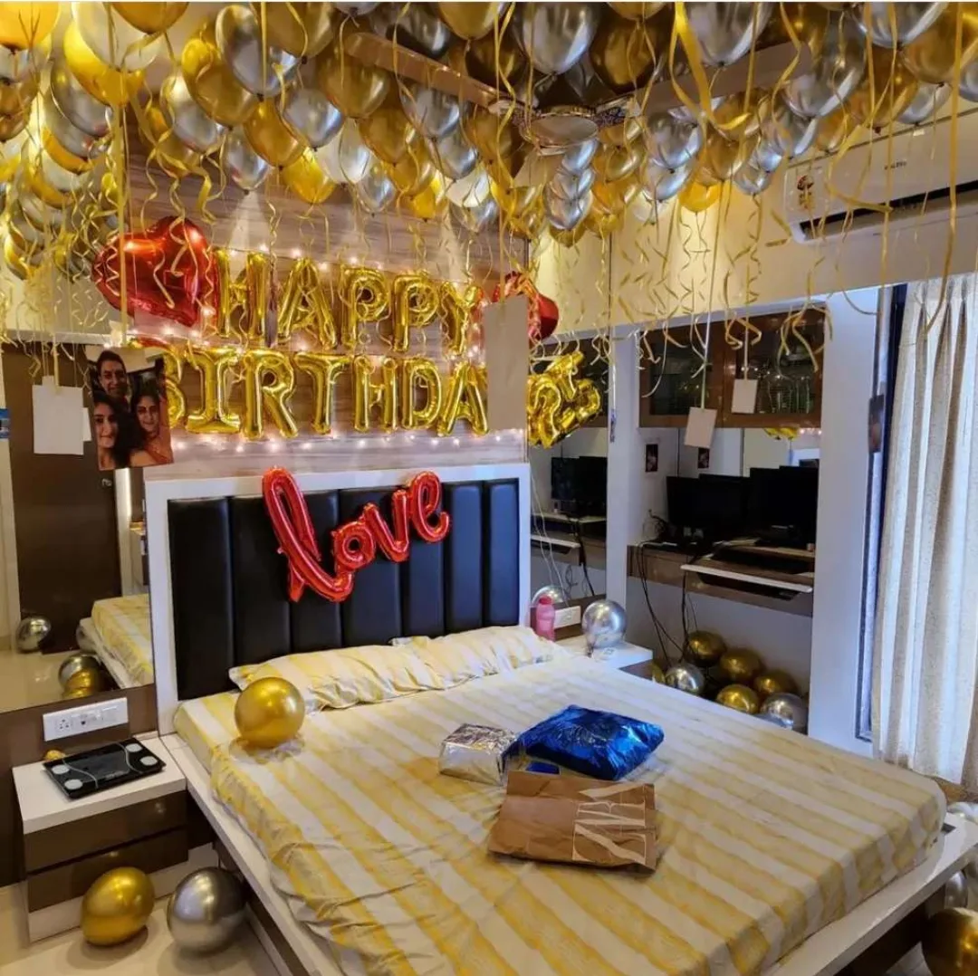 This romantic bedroom surprise setup is perfect for celebrating a special someone's birthday in an intimate and heartwarming way. The ceiling balloon decor, fairy lights, and personalized touches create a cozy and festive atmosphere.