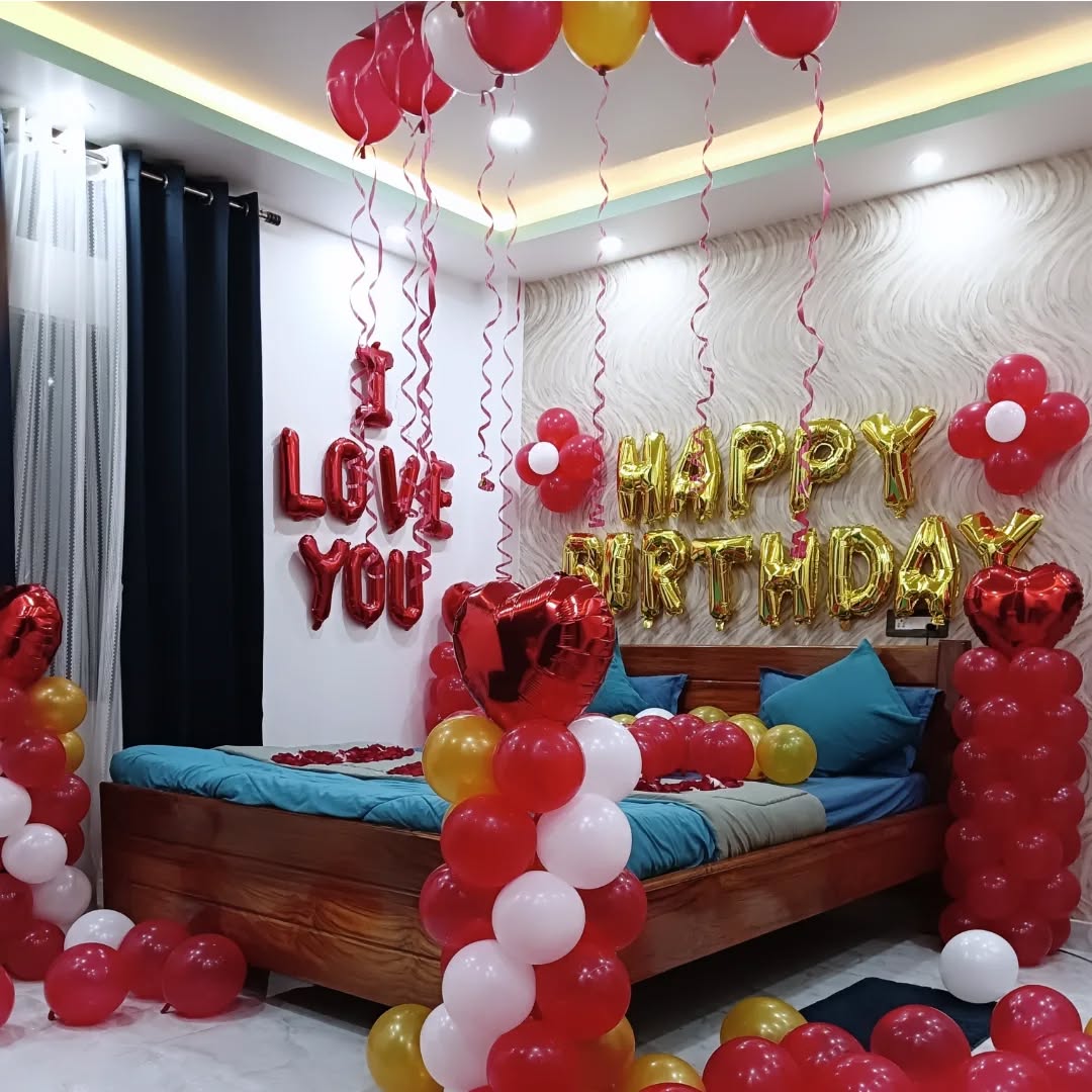 This romantic bedroom decoration setup is perfect for celebrating a loved one's birthday or special occasion. The design includes "I LOVE YOU" red foil balloons, "HAPPY BIRTHDAY" gold foil balloons, a heart-themed balloon arrangement, and rose petals for a magical touch. The combination of red, g...