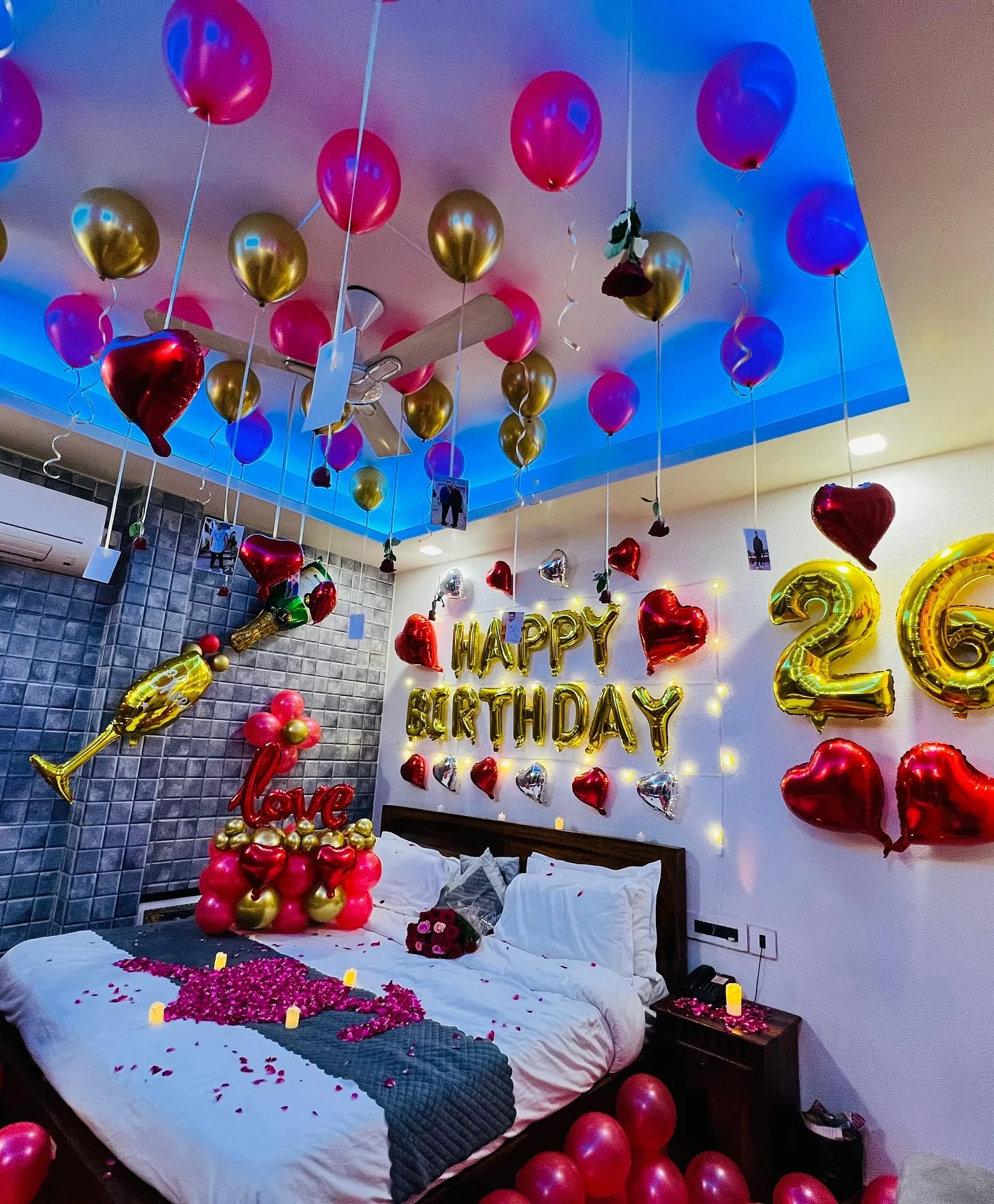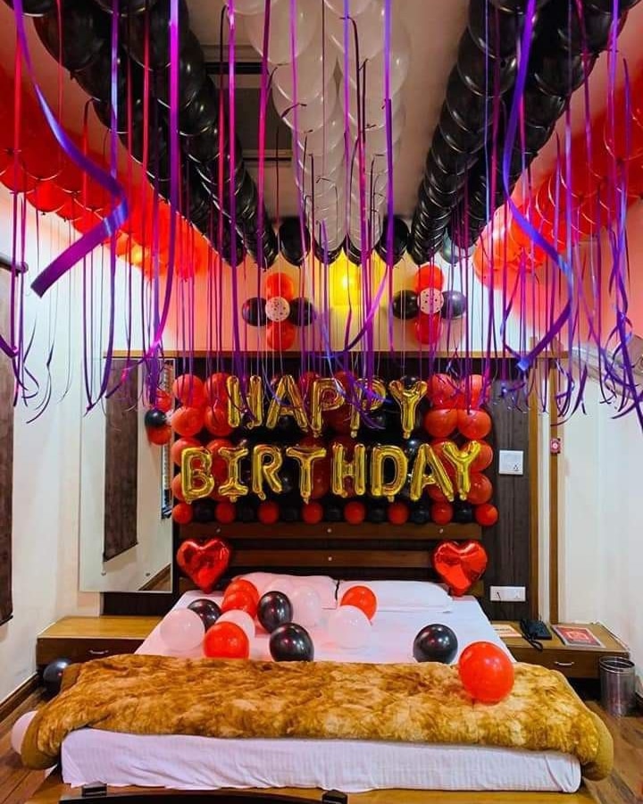 ✯✯This romantic and elegant bedroom decoration features a black, red, and gold theme, making it perfect for an intimate birthday surprise. The balloon-filled ceiling with hanging ribbons creates a dreamy atmosphere, while the