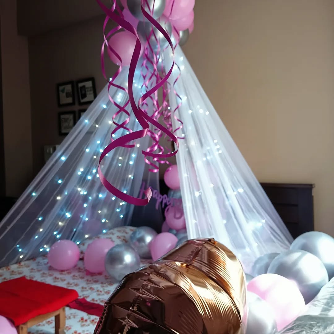 This romantic canopy decoration is designed for special celebrations like birthdays, anniversaries, or surprise proposals. It features a white sheer canopy with twinkling fairy lights arranged over a bed, creating a dreamy and intimate ambiance. Pink and silver balloons are spread across the bed ...
