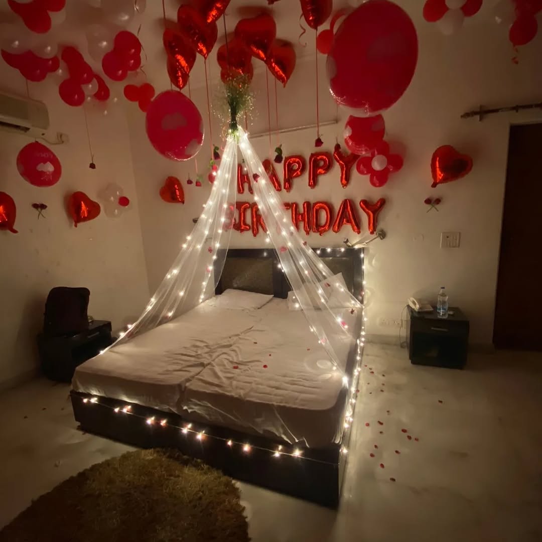 *️⃣This romantic bedroom decoration is designed to create an intimate and dreamy atmosphere for a special birthday surprise. The red and white balloons, heart-shaped foils, fairy lights, and sheer *️⃣canopy transform the space into a cozy and love-filled setting. Perfect for celebrating a loved o...