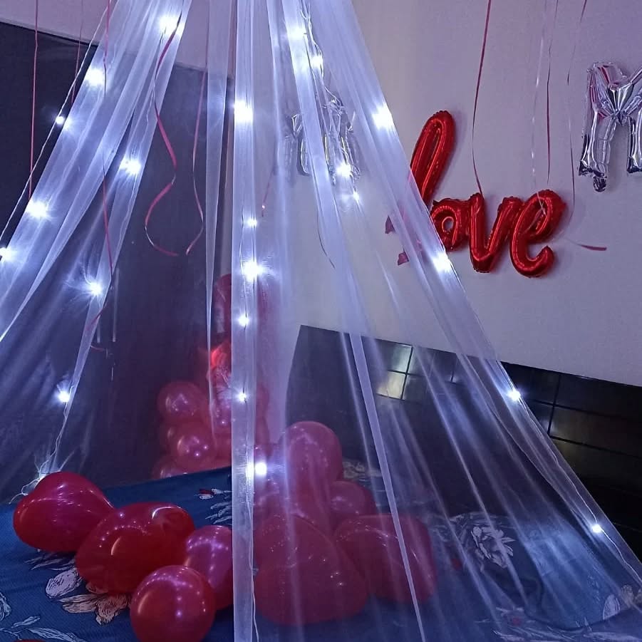 *️⃣This romantic canopy decoration features a soft white net drape with warm white LED fairy lights that create a dreamy and intimate atmosphere. The bed is covered in red balloons, adding a pop *️⃣of color and passion. A "Love" foil balloon on the wall completes the romantic setup, making it ide...