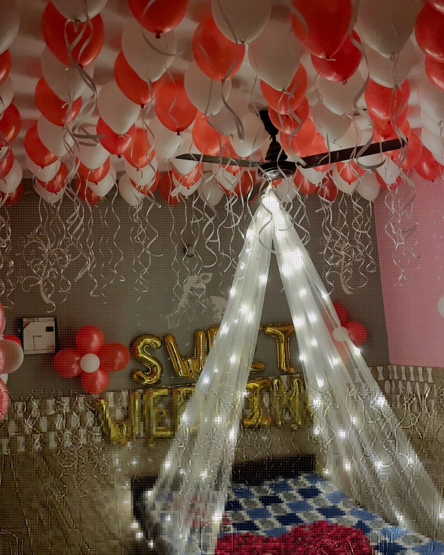 ✅Ceiling Balloons: ~150-200 (red and white latex balloons).
