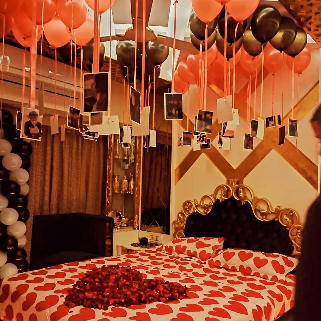 This romantic room decoration is perfect for anniversaries, proposals, birthdays, or special surprise celebrations. The floating ceiling balloons with attached memorable photos and love notes create an emotional and intimate ambiance.