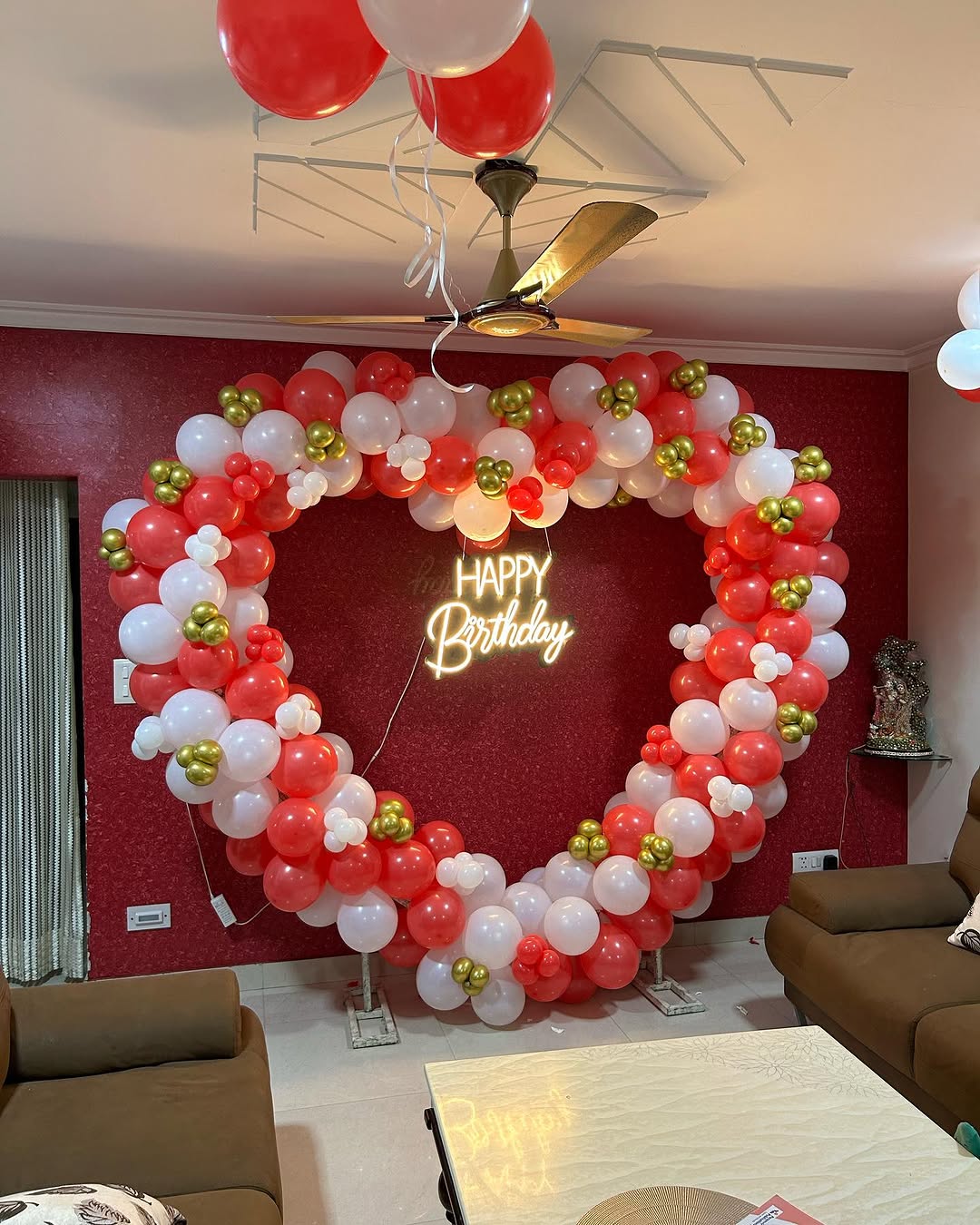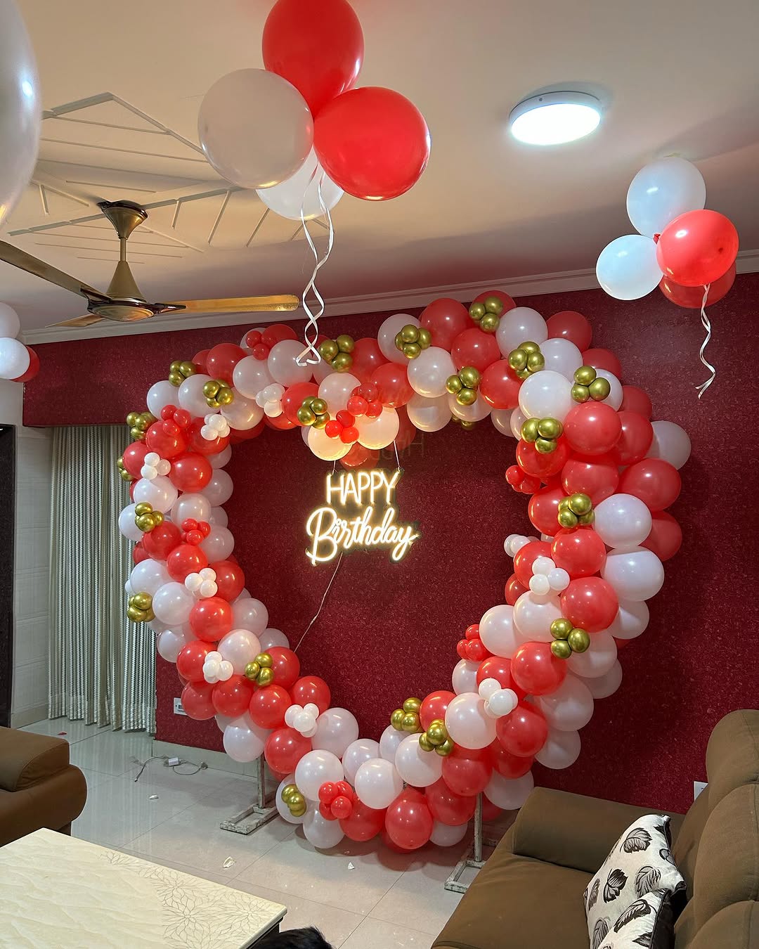 This stunning heart-shaped balloon arch is designed for romantic celebrations, anniversaries, birthdays, or special events. The color theme features red, white, and gold balloons, symbolizing love, joy, and elegance. A "Happy Birthday" LED neon sign is placed at the center, adding a glowing, cele...