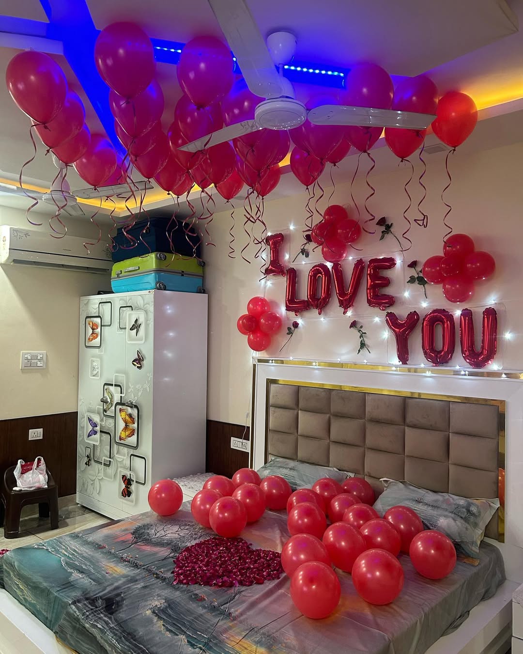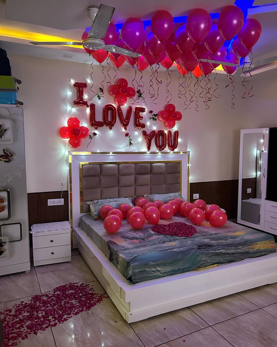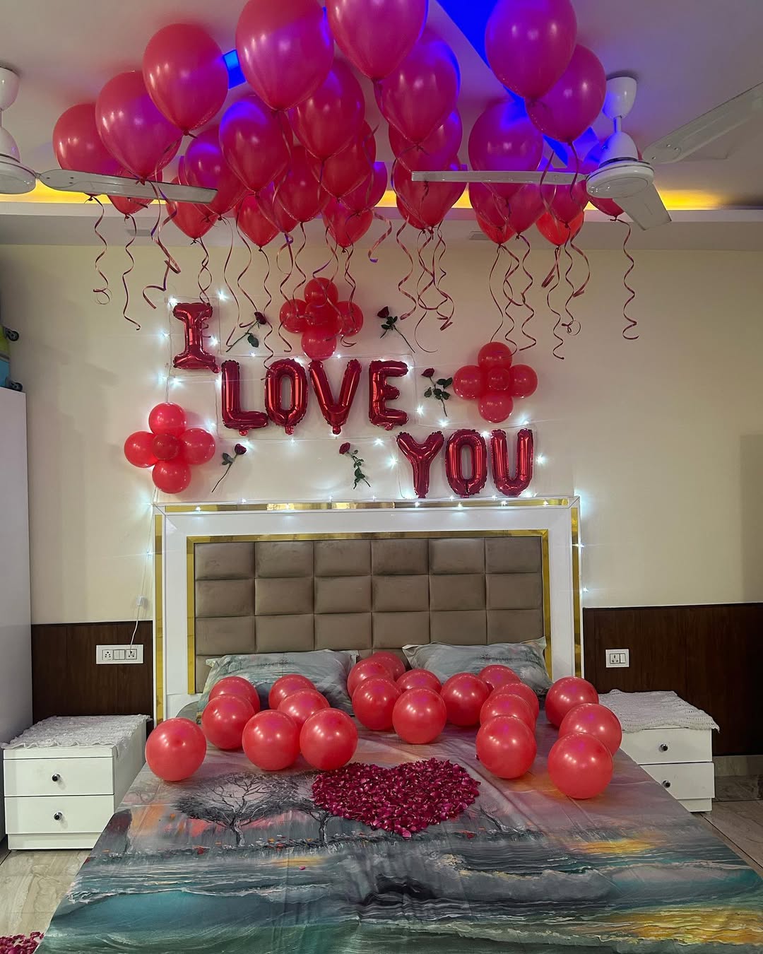 This romantic "I Love You" bedroom decoration is designed for special occasions like anniversaries, proposals, or Valentine’s Day. The setup features: