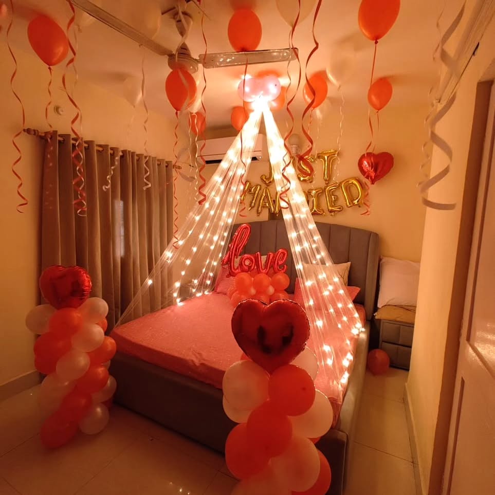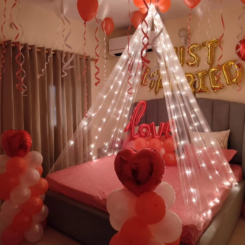 This beautifully intimate room decoration is designed for newlyweds, anniversaries, or special romantic occasions. The setup features a canopy of soft LED fairy lights draped elegantly over the bed, creating a dreamy ambiance. Surrounding it are heart-shaped balloons, "Just Married" golden foil l...