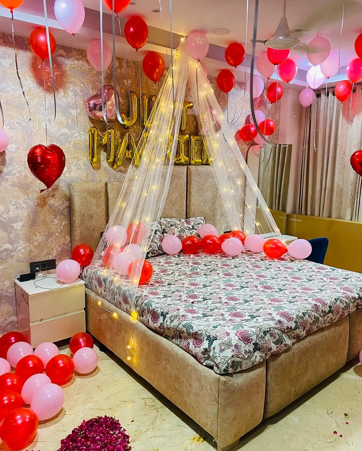 This romantic bedroom decoration is designed for newlyweds or anniversary celebrations. The setup includes a beautiful canopy net with fairy lights, heart-shaped balloons, and floating ceiling balloons, creating an intimate and cozy ambiance. The "Just Married" golden foil balloons add a celebrat...