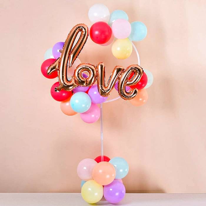 This beautiful and vibrant balloon arrangement features a rose gold "love" foil balloon as the centerpiece, surrounded by an assortment of colorful pastel and red balloons. The design is structured around a white hoop stand, with additional balloons at the base for stability. This elegant decorat...