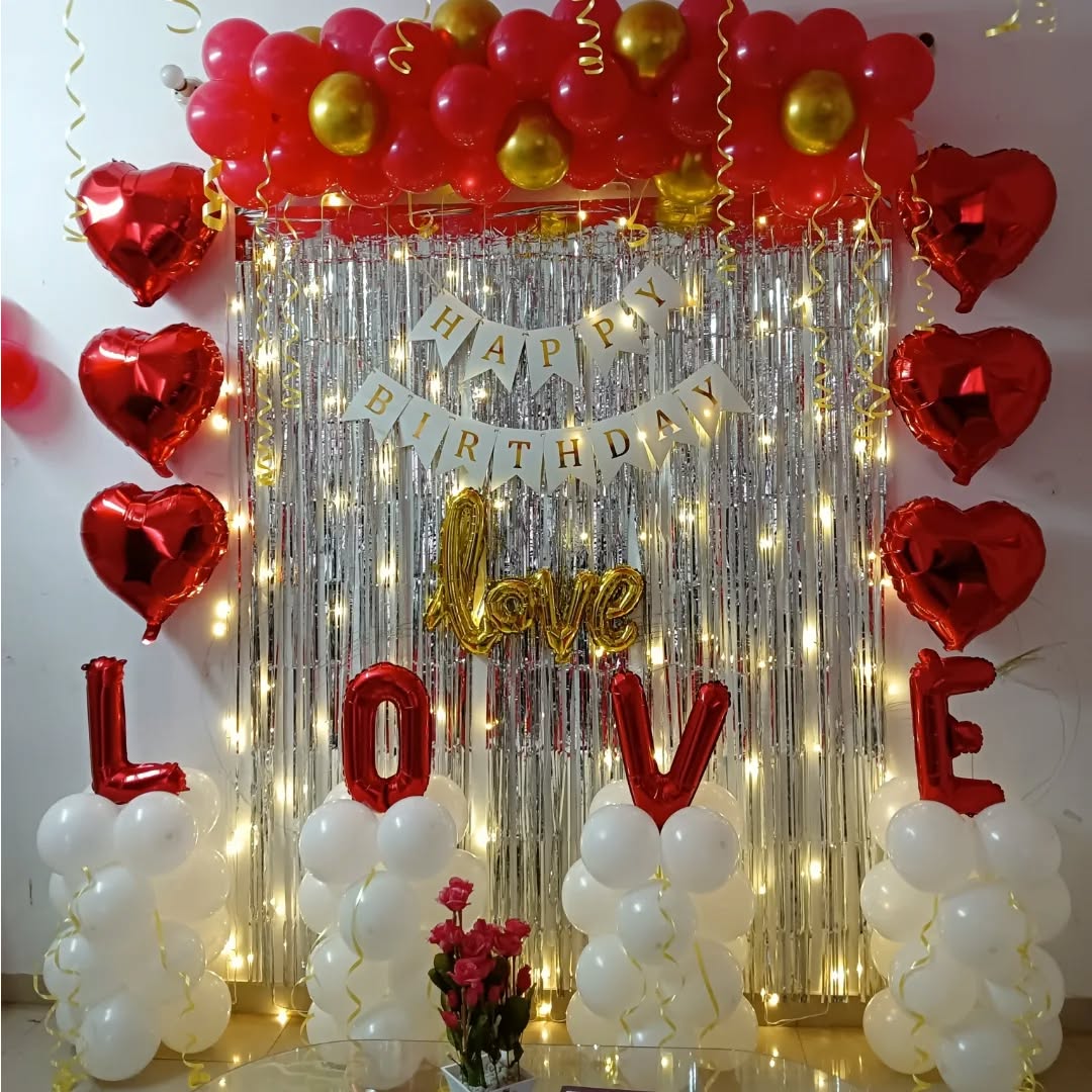 This romantic balloon backdrop is designed for birthday celebrations, anniversaries, and romantic surprises. The shimmering silver foil curtain, combined with heart-shaped balloons, warm fairy lights, and "LOVE" balloon letters, creates a stunning and intimate ambiance. The setup makes for an Ins...