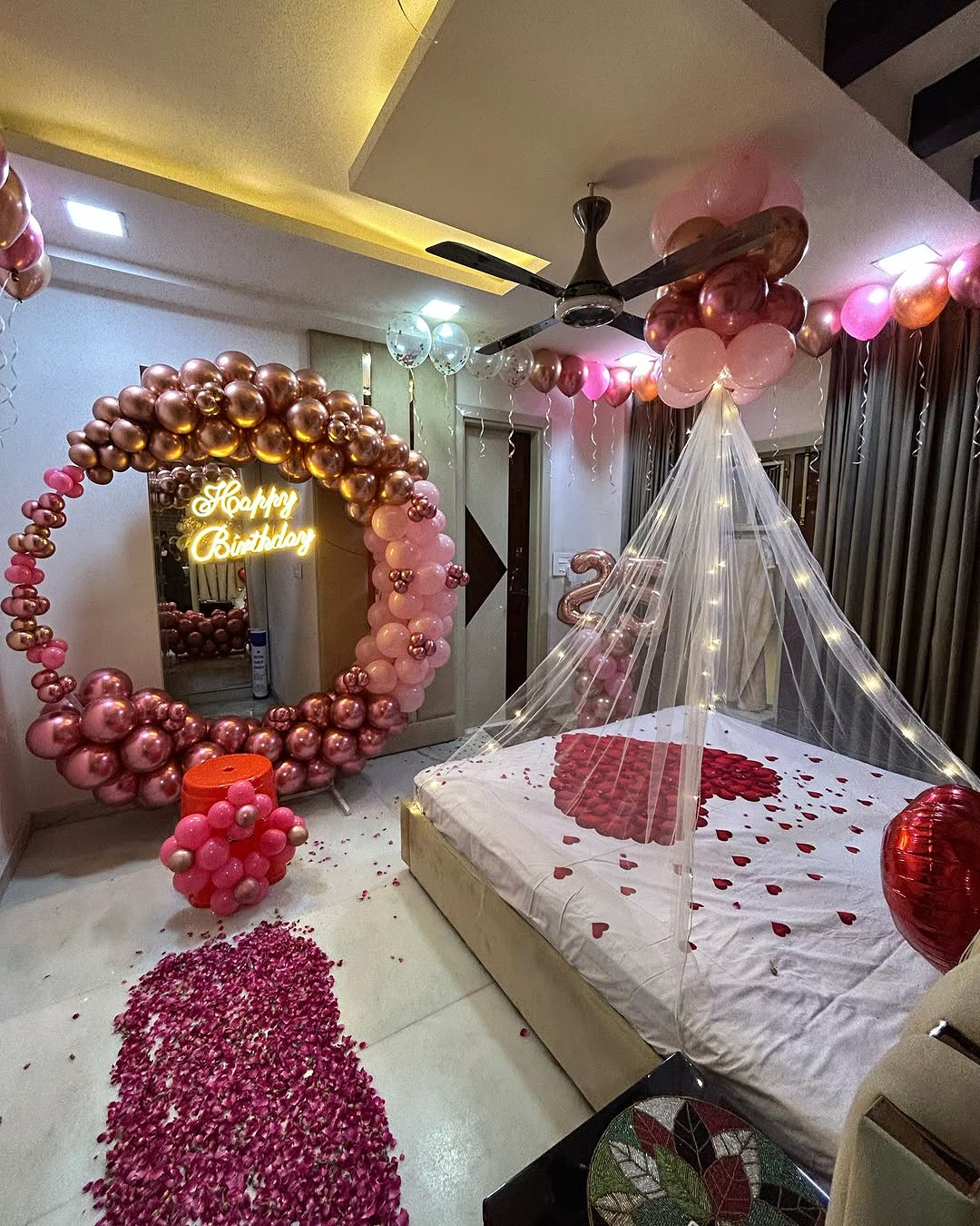This luxurious romantic birthday room décor is designed to create an intimate and dreamy ambiance. The centerpiece is a stunning rose gold balloon arch with different-sized balloons for a rich, layered effect. A neon "Happy Birthday" sign adds a warm glow to the space.