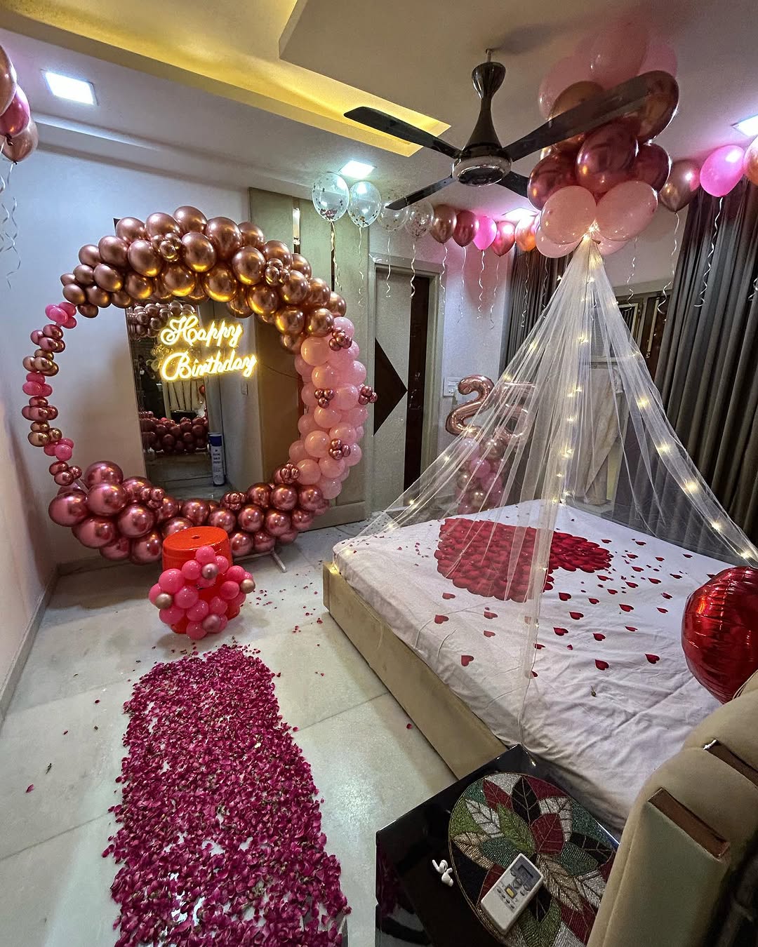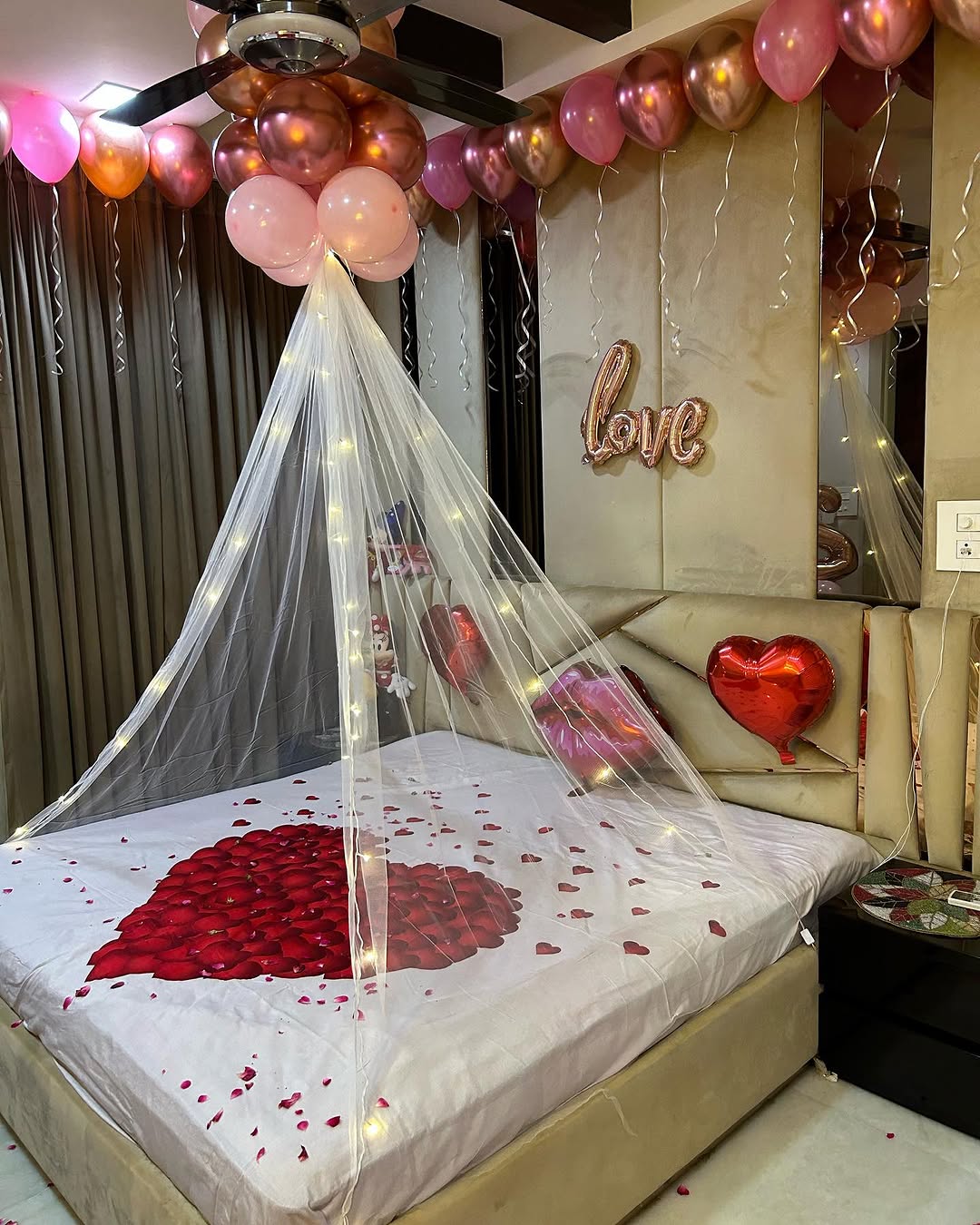 ⭐Setup Time: Requires 4-5 hours for perfect balloon arrangement, lighting setup, and rose petal decoration.