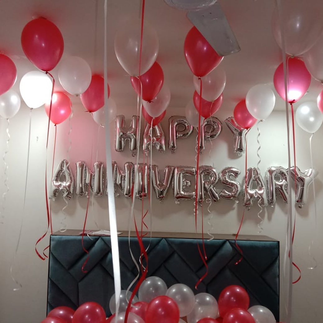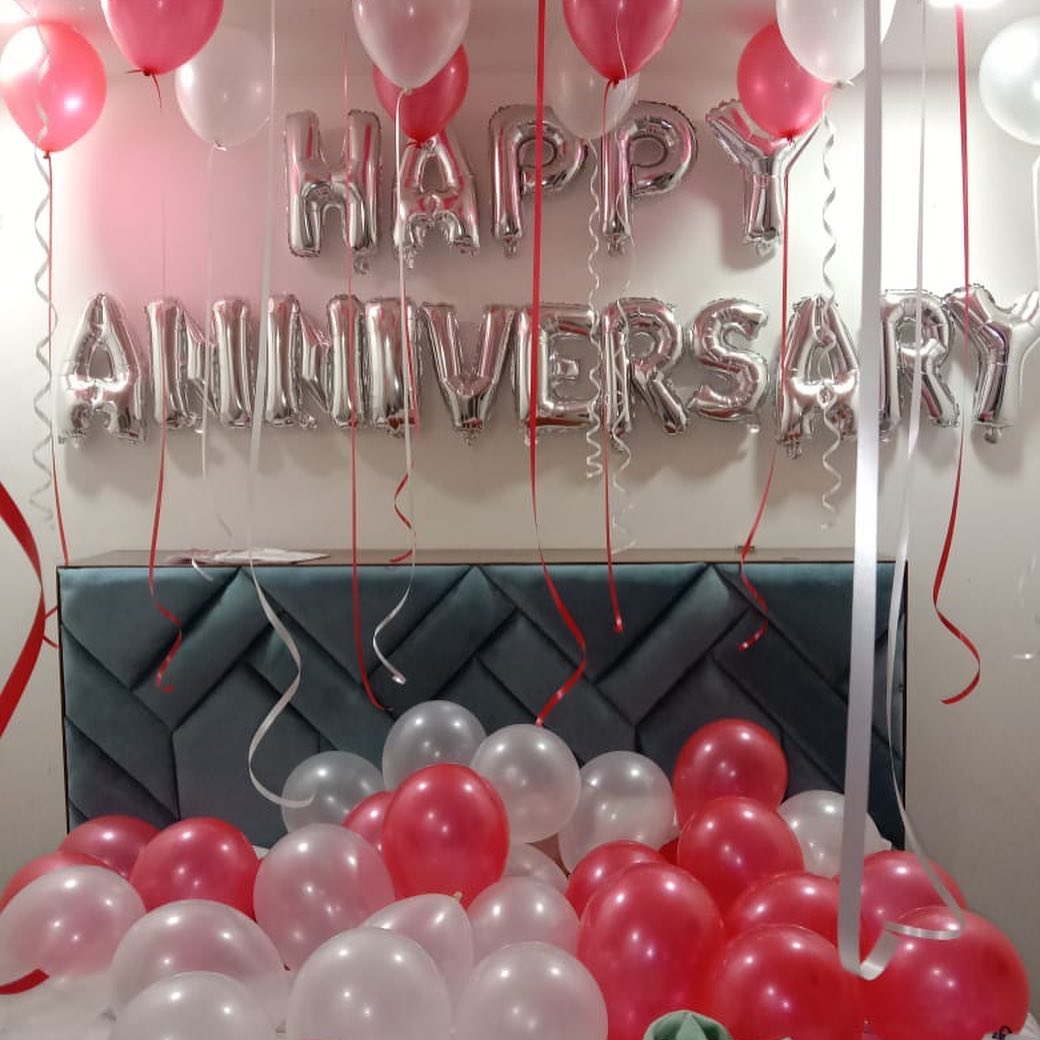 This simple yet elegant anniversary decoration features silver foil letter balloons spelling "HAPPY ANNIVERSARY" as the backdrop, paired with floating helium balloons and a bed full of red and white air-filled balloons. The combi...