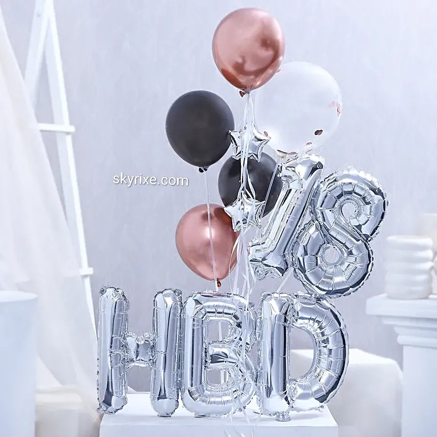 A stylish milestone birthday balloon arrangement featuring large silver foil “18” numerals paired with chrome rose gold and black balloons, a clear confetti balloon, and elegant silver “HB D” letter foils. This chic metallic palette makes it perfect for 18th birthday surprises, room décor, or cel...