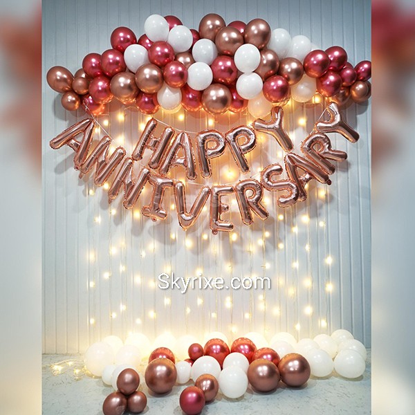 Celebrate your special milestone with the Rose Gold Glow Anniversary Backdrop Décor, designed to create a warm, elegant, and photo-ready celebration space. This setup features a luxurious rose-gold, blush, and white balloon arrangement paired with cascading warm fairy lights and ...