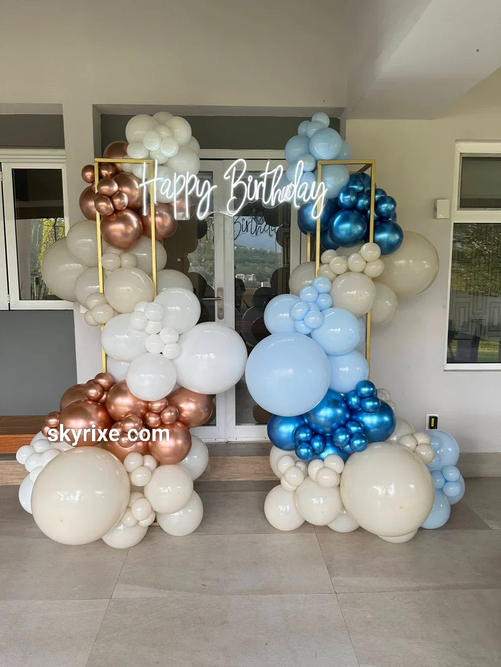 Create a sophisticated and welcoming celebration entry with this premium dual-tone balloon frame décor. Designed as a modern entrance arch, the setup features two structured gold metal frames decorated with organic balloon clusters in elegant ivory, pastel blue, metallic blue, and rose gold tones...