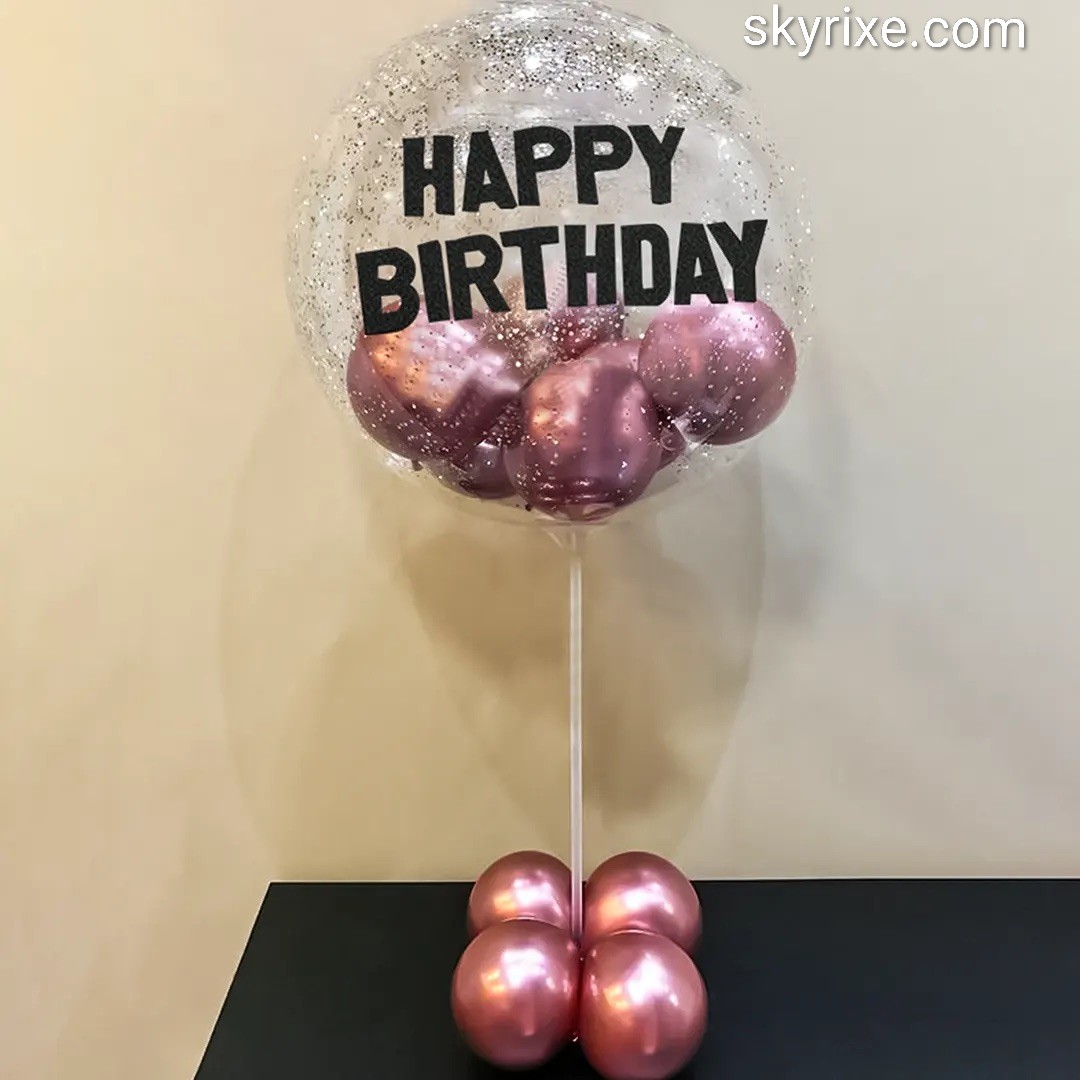 A premium birthday balloon stand featuring a large transparent confetti bubble balloon with bold “Happy Birthday” print and elegant rose gold chrome balloons inside. Mounted on a slim white stand with a matching rose gold balloon base cluster, this design adds a classy metallic touch to cake tabl...