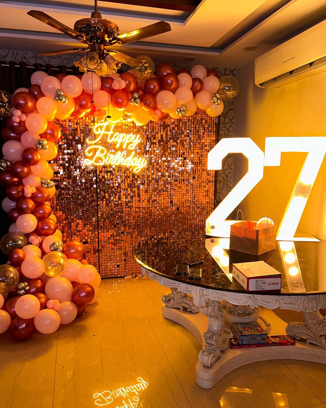 *️⃣This stunning rose gold and peach balloon arch features a shimmering copper sequin backdrop with a glowing "Happy Birthday" neon sign. The arrangement is complemented by a large *️⃣illuminated "27" marquee number, making it perfect for milestone celebrations. The combination of warm lighting a...