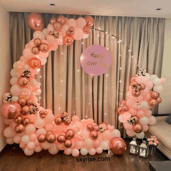 A luxurious crescent-shaped balloon backdrop in blush pink, peach, and rosegold chrome tones, paired with a fairy-light halo ring and a pastel birthday signage disc. Accented with mini floral clusters and premium balloon layering, this elegant setup creates a sophisticated focal point for birthda...