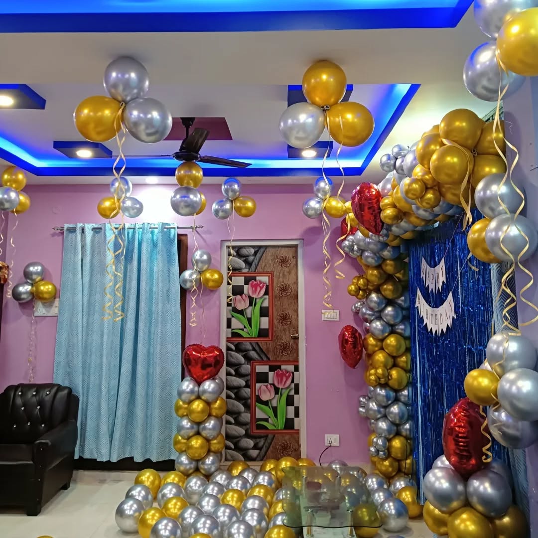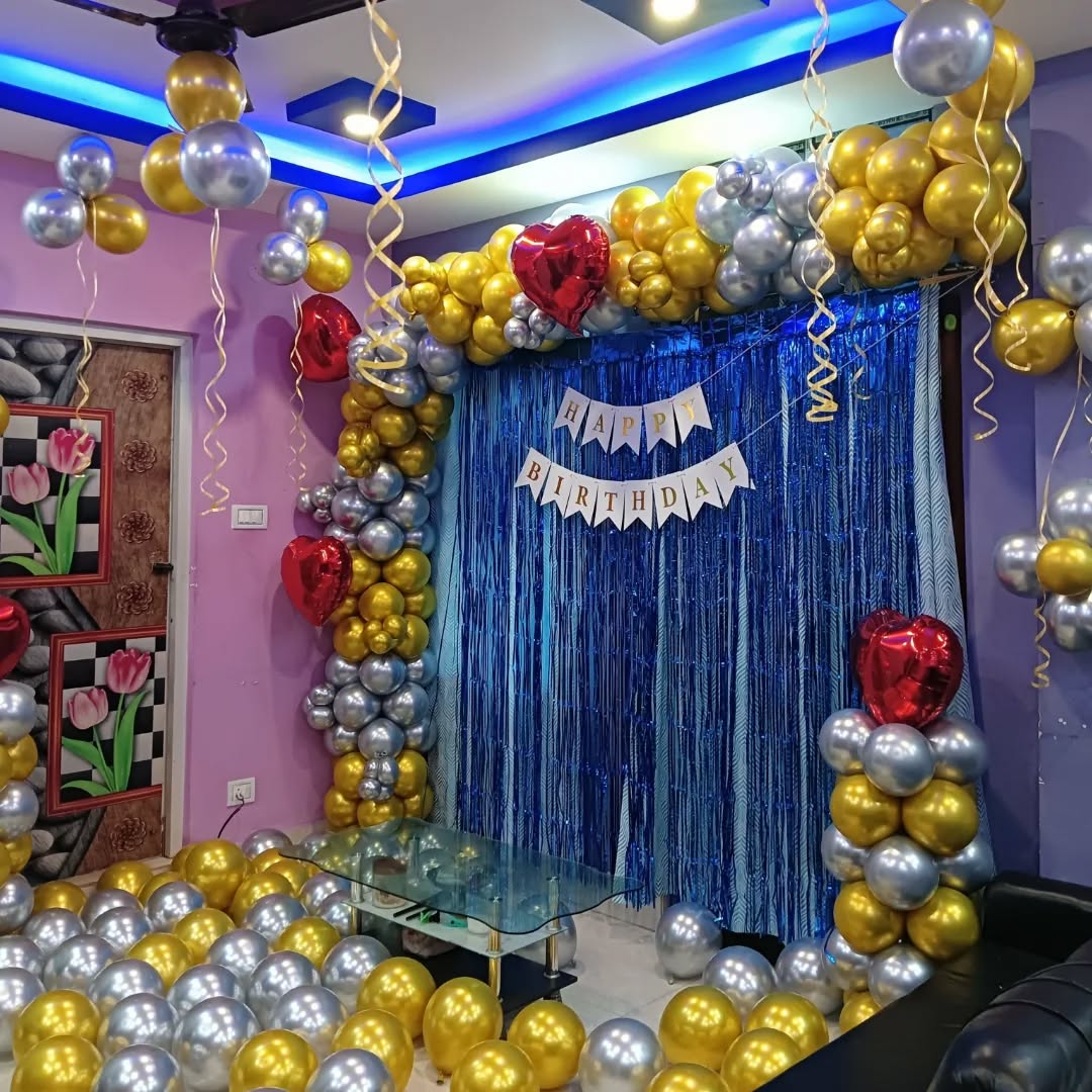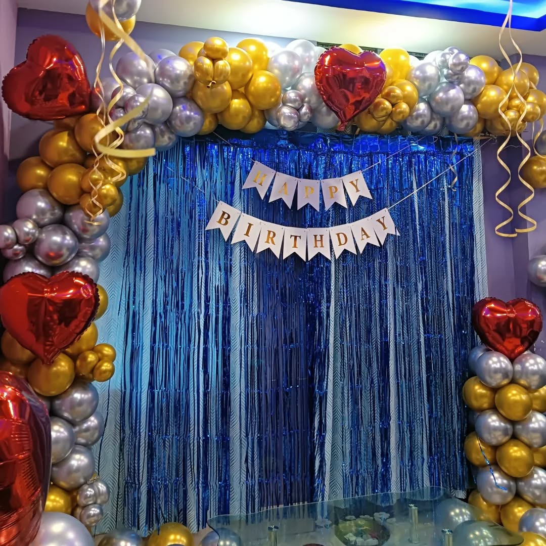 Elevate your birthday celebration with this luxurious royal blue and gold balloon décor. The setup features a shimmering blue backdrop, metallic gold and silver balloon garlands, and red heart-shaped foil balloons for an elegant and grand birthday theme. This decoration is perfect for adults’ bir...