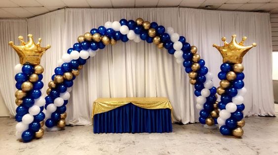 This majestic and regal balloon arch is designed for royal-themed celebrations, featuring a spiral balloon arch in royal blue, white, and metallic gold. The two grand columns on either side are topped with golden foil crown balloons, adding a luxurious and kingly touch. A perfect setting for a pr...
