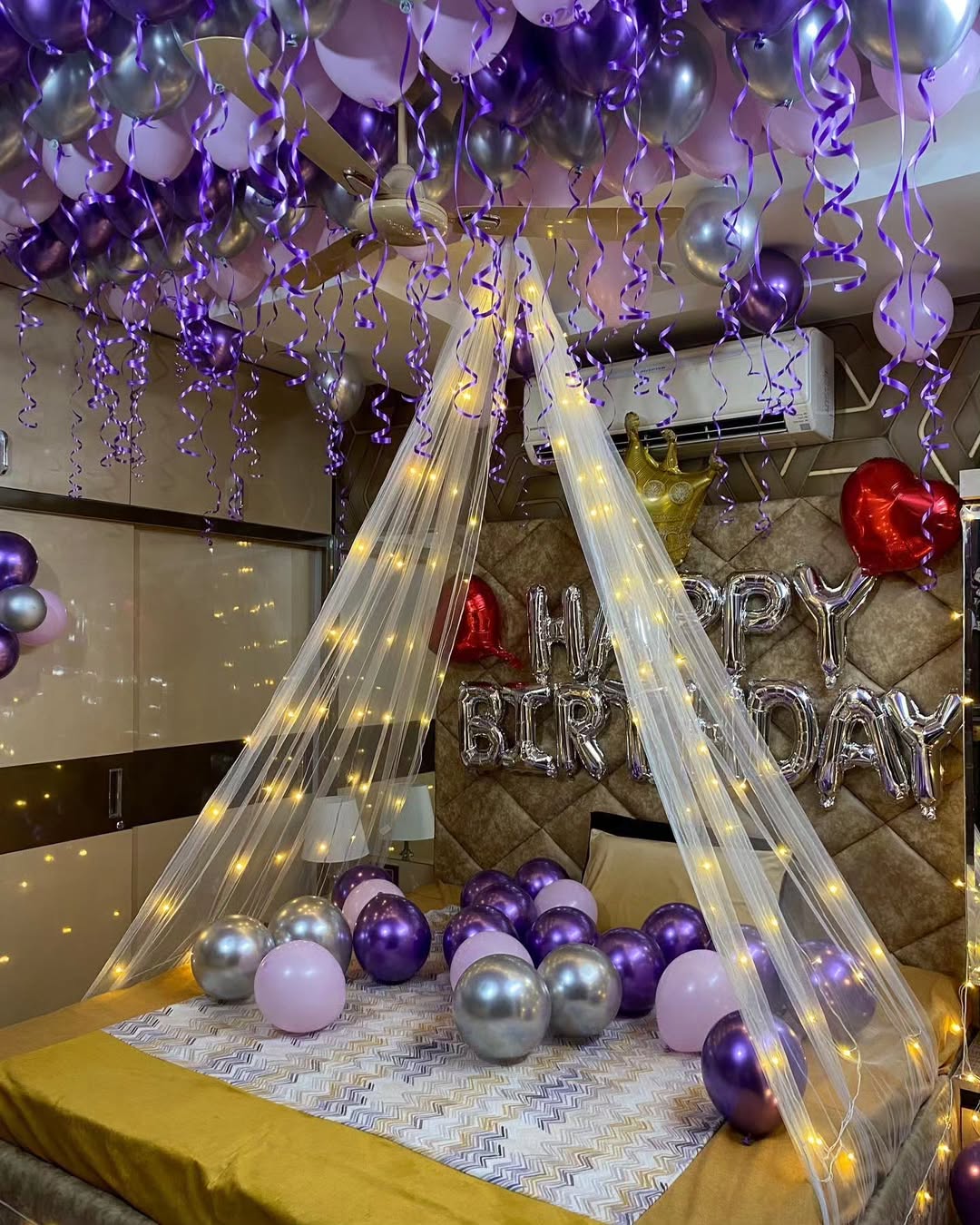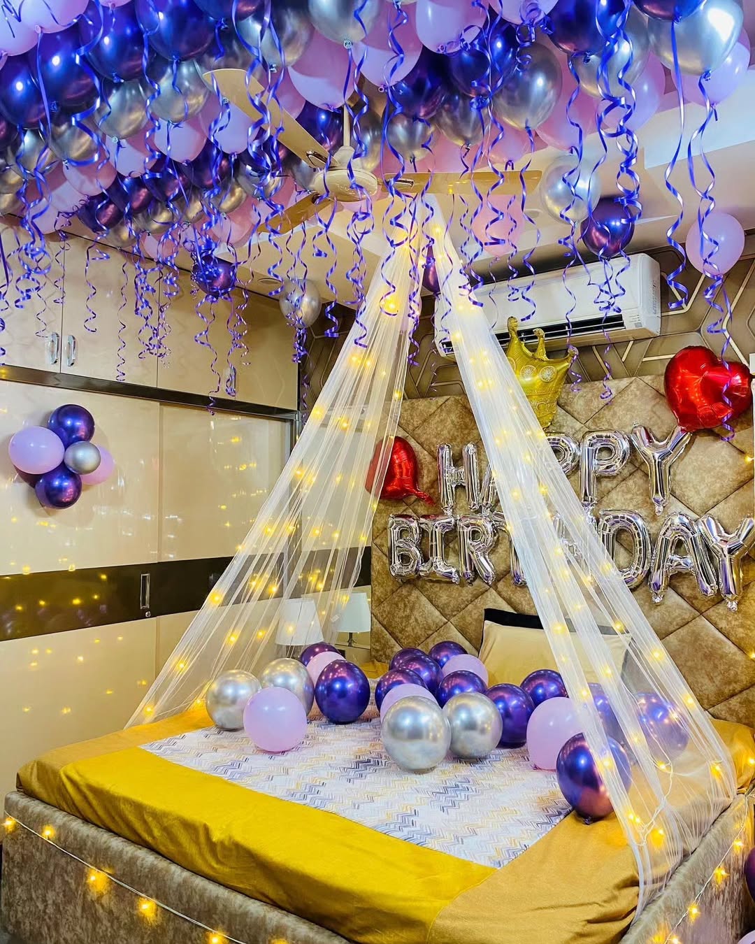 This stunning birthday bedroom decoration features a luxurious mix of blue, silver, and purple tones. The ceiling is adorned with helium balloons and curly ribbons for a dreamy effect. A sheer canopy with warm fairy lights adds a romantic touch, making it an ideal surprise setup. The silver "Happ...