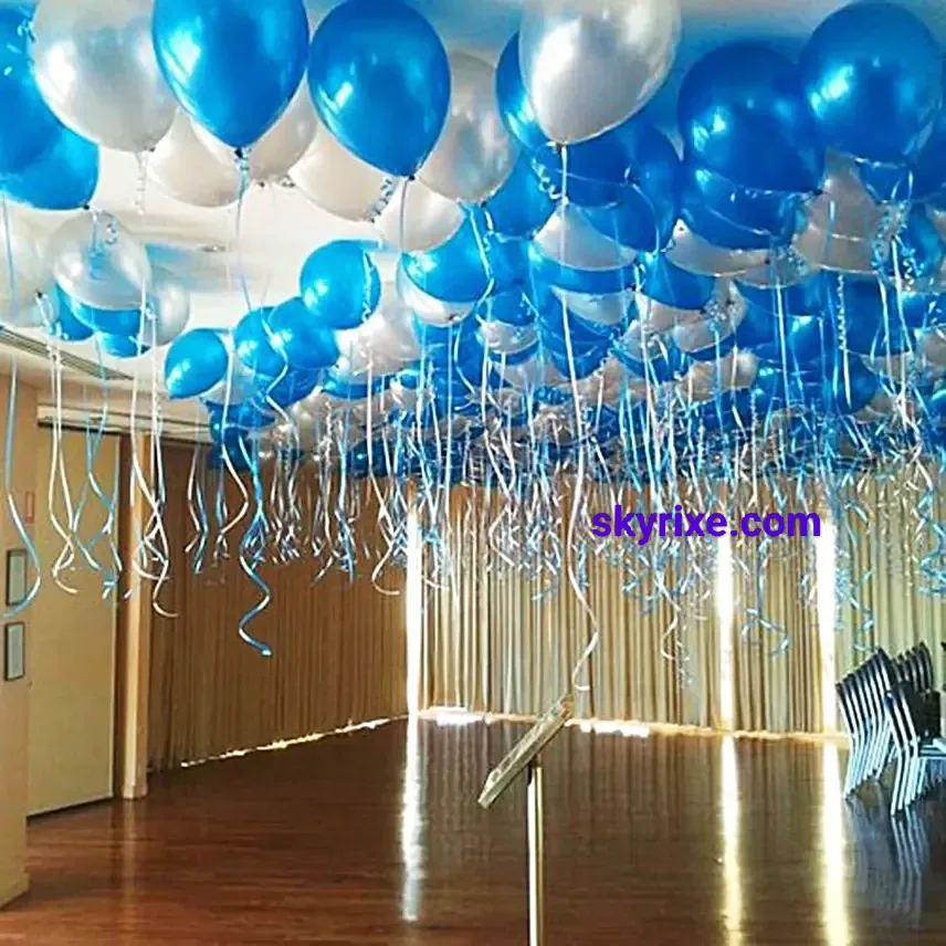 Walk into a venue transformed by a floating sea of blue and silver balloons above — ribbons gently swaying to create a grand, immersive celebration feel. The canopy effect adds depth and drama to the space, making it ideal for photos, stage areas, and dance floors.
